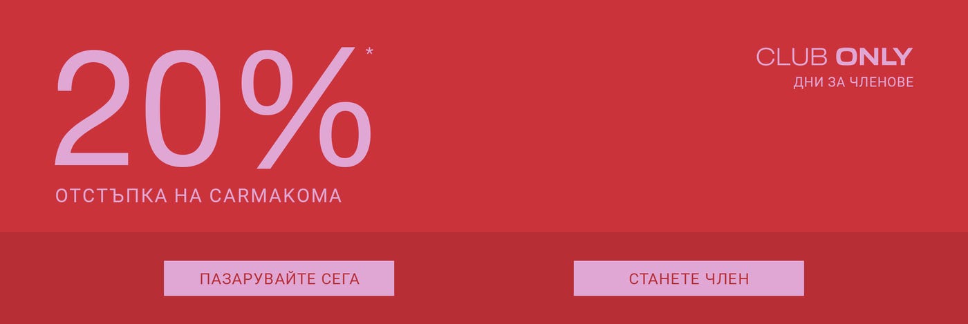 *Ексклузивно за членове от 24.04 до 26.04.2026 г. Не се прилага за дънки. Само за избрани марки. Не може да се комбинира с други отстъпки или промоции.