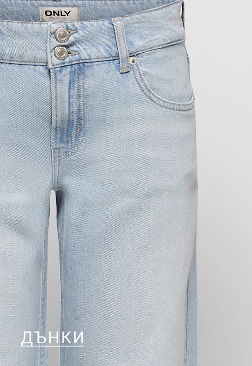 От самото начало ONLY е известна с манията си по перфектно прилепналите дънки — и това не се е променило! Разгледайте широката ни селекция от дънки с ниска, средна и висока талия в класически шарки, дръзки изтъркани стилове и модерни кройки. Но ние не се спираме само с дънки — открийте дънкови якета, поли и още, за да завършите визията си. Независимо дали обичате вечната класика или смели нови тенденции, нашата колекция от деним има нещо за Вас.##