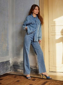 Træd direkte ind i sæsonens største trend i vores chikke blå denim-sæt. Sættet består af en skjorte med trykknapper og lange ærmer samt højtaljede brede jeans. Med dette outfit udviser du den essentielle modebevidste elegance.