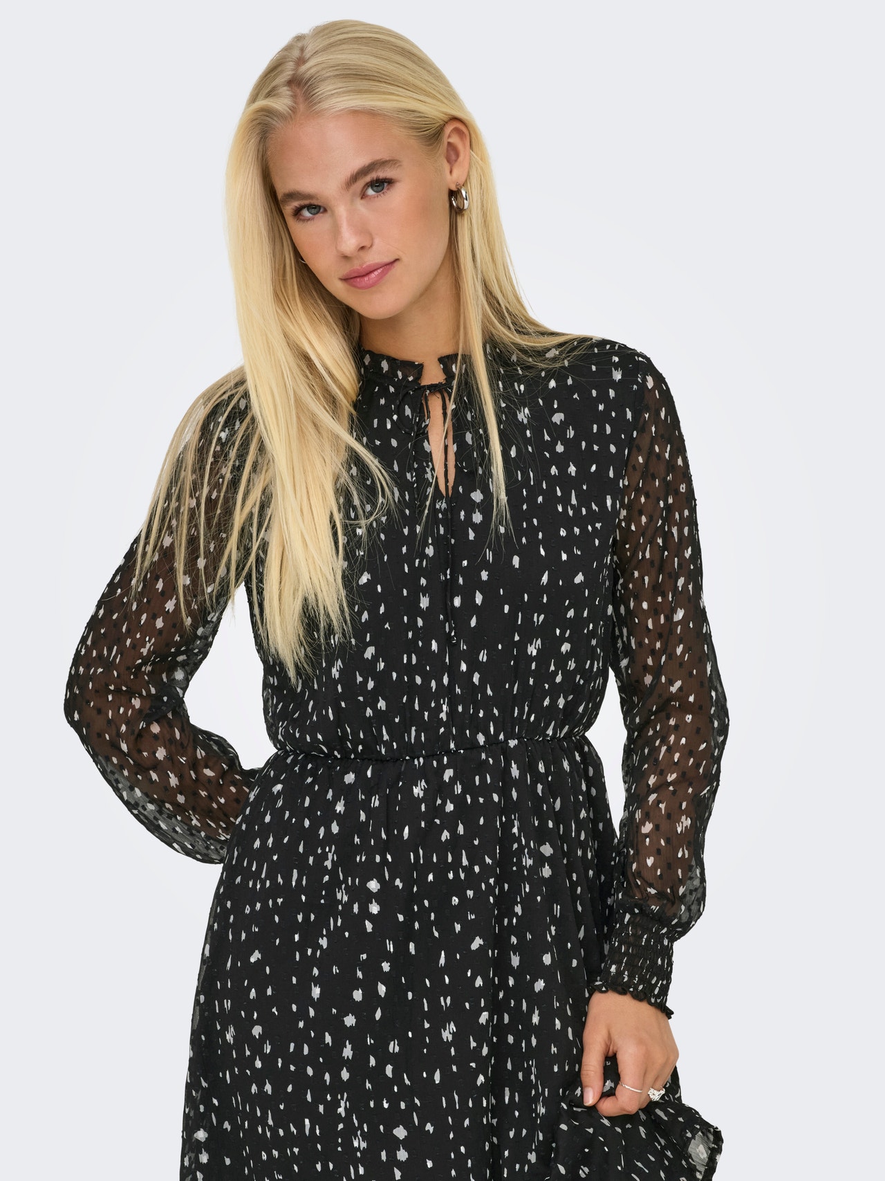 Uanset om det gælder en havefest, en tur i byen eller en middag på en restaurant, er dette occasionwear et perfekt valg. - Produkttype : Kjole - Hals : Skjortekrave - Ærme : Lange ærmer - Manchetter : Manchetter med smock - Længde/størrelse : Mini-længde - Detaljer : Skæringslinje i taljen - Pasform : Regular fit