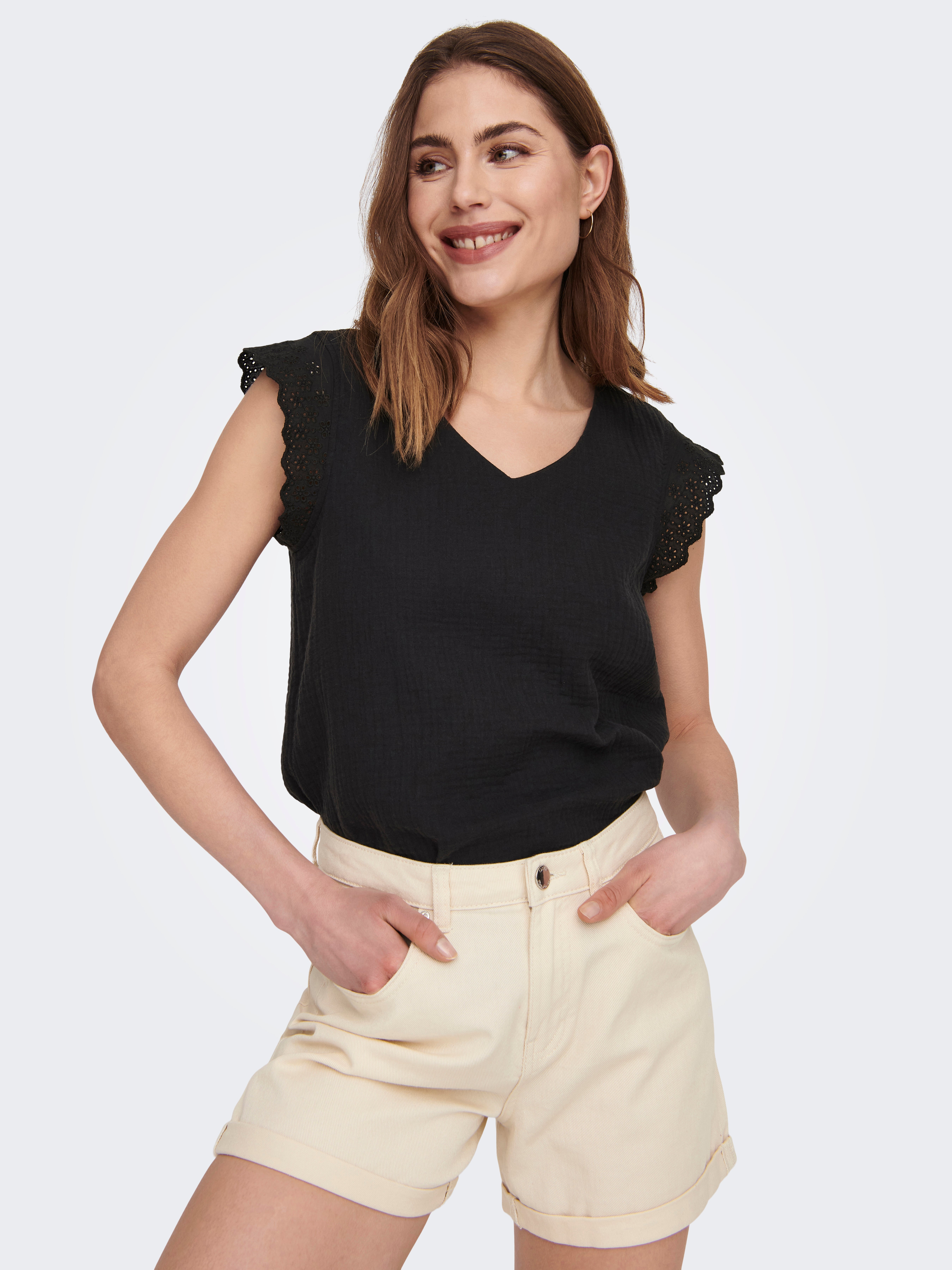 - Ærme : Korte ærmer