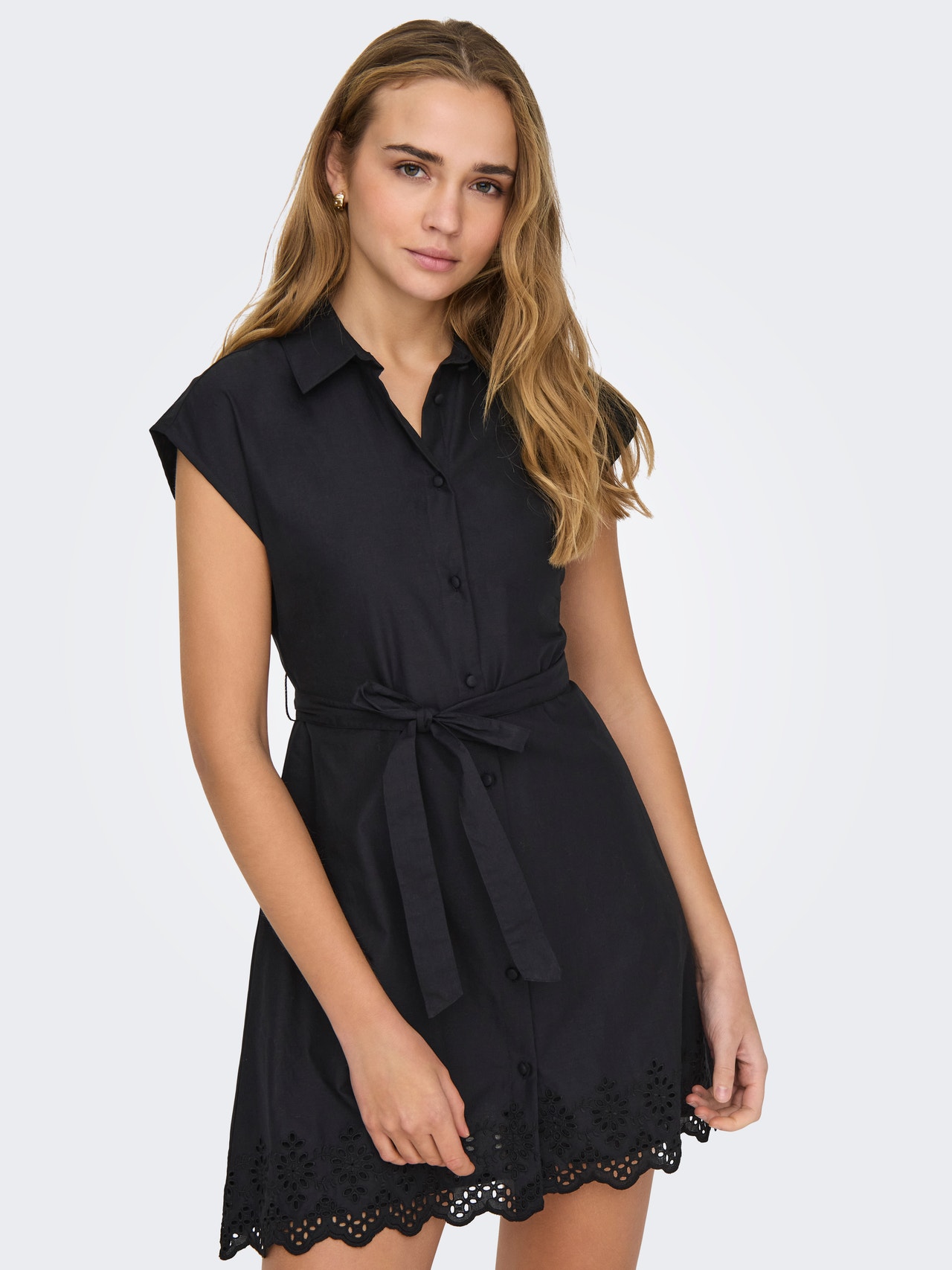 Gør dig klar til arbejde, skole eller anden aktivitet med en hverdagskjole, der er nem at style. Vævede materialer skabes ved at væve to eller flere garner sammen, hvilket skaber et tidløst look. - Produkttype : Kjole - Hals : Skjortekrave - Ærme : Korte ærmer - Lukning : Knaplukning - Længde/størrelse : Mini-længde - Detaljer : Bælte i taljen, Broderie anglaise-detalje, Muslingedetalje - Pasform : Regular fit