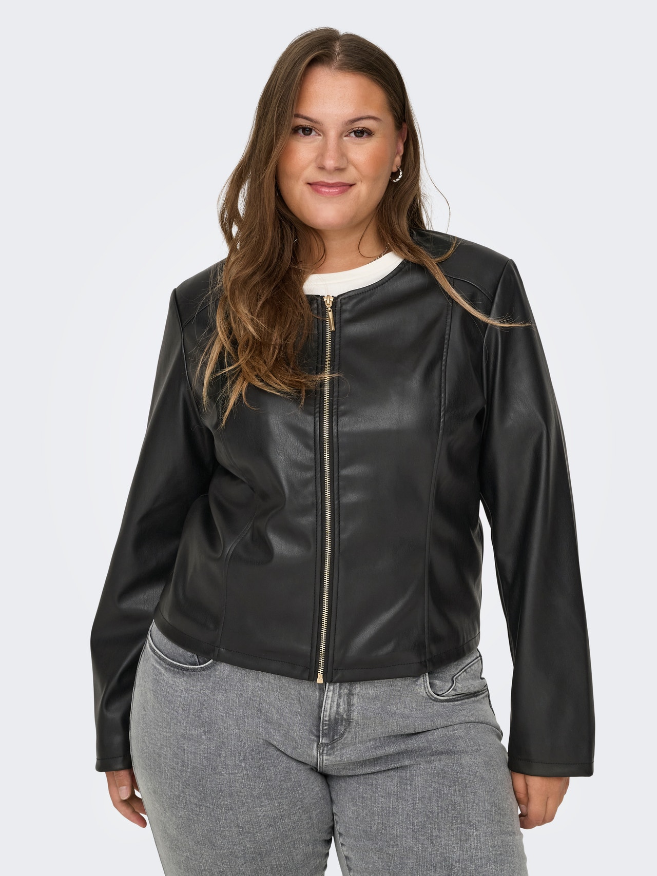 Se skøn ud på skolen, arbejdet og til hverdagsaktiviteterne med seje styles, der er nemme at matche med dine favoritter i skabet. ONLY CARMAKOMA er et internationalt modemærke til kvinder med kurver i størrelse 42-54, der skaber styles, som fremhæver alle fordelene ved den smukke, feminine og kurvede silhuet og får dig til at se fantastisk ud hele dagen lang, hver dag. Curve er designet til at passe den kurvede kvinde. - Produkttype : Jakke i imiteret læder - Neck : Biker krave - Ærme : Lange ærmer - Lukning : Lynlåslukning - Længde/størrelse : Kort - For : For i polyester for en behagelig følelse - Kropstype : Curve