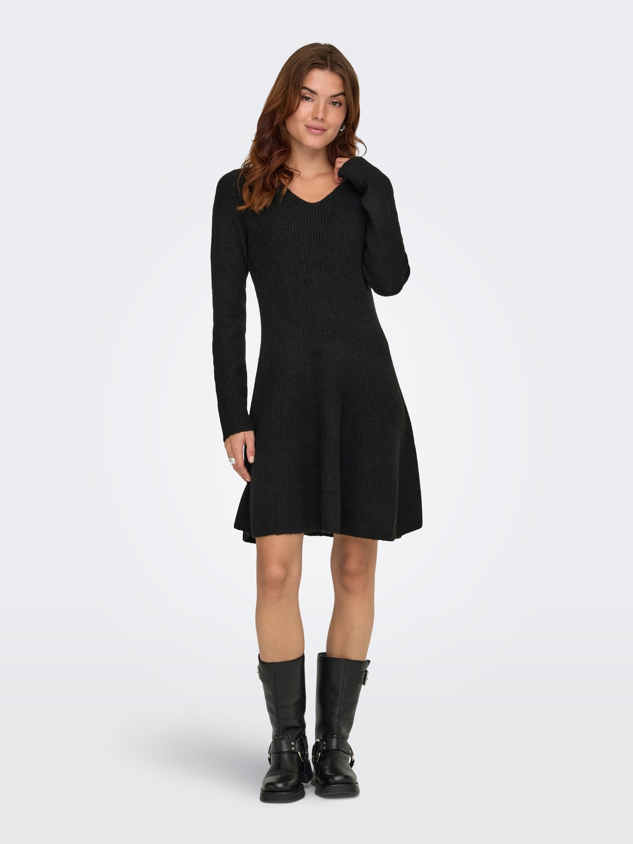 Bereite dich mit einem hübschen Strickkleid auf kalte Tage vor und kombiniere es mit einer Strumpfhose oder einer Jeans.