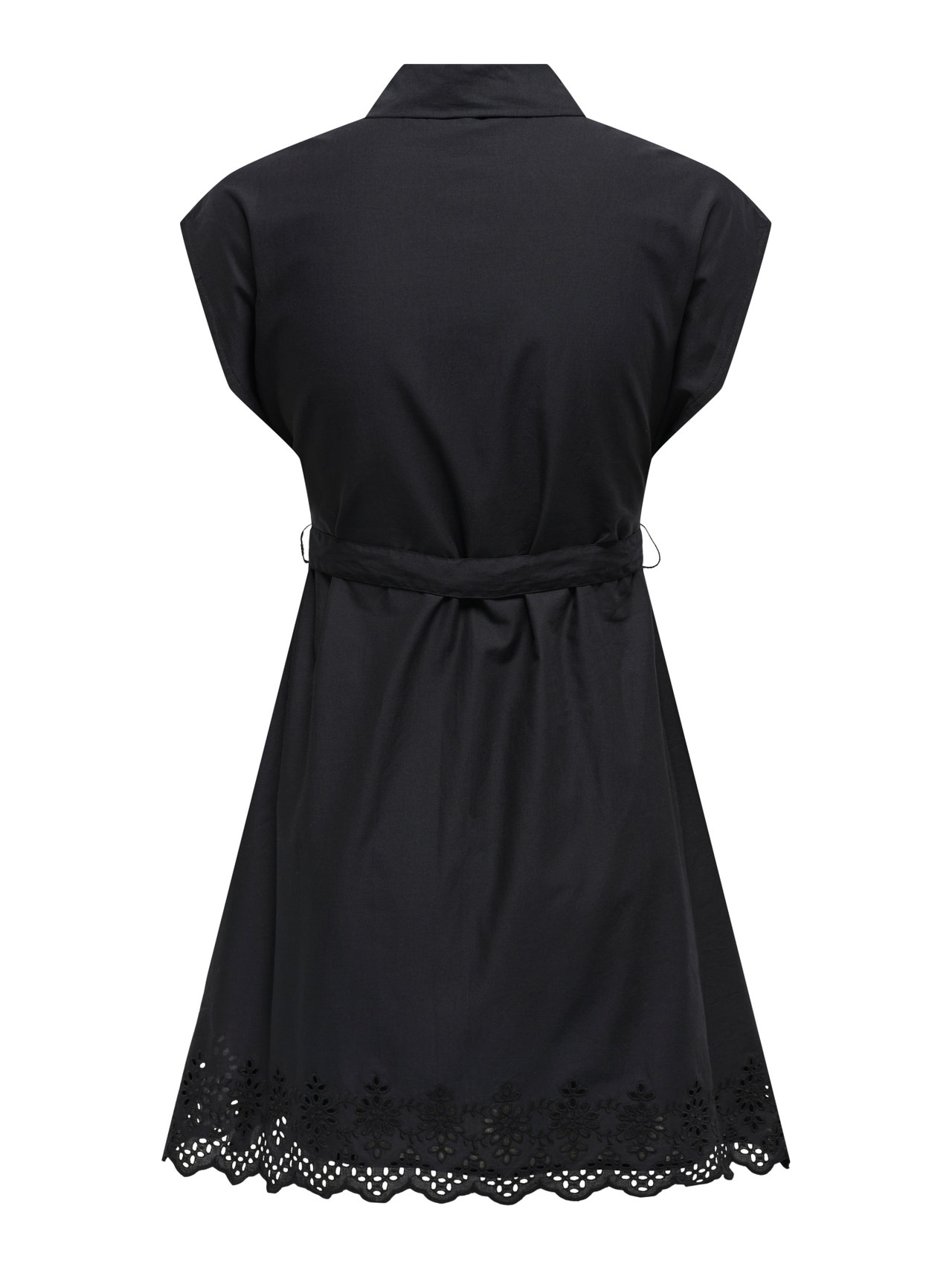 Mit einem einfach zu stylenden Alltagskleid bist du bereit für die Arbeit, die Schule und alles andere. Gewebte Stoffe werden durch das Verweben von zwei oder mehr Garnen hergestellt und erhalten so ein zeitloses Aussehen. - Produkttyp : Kleid - Hals : Hemdkragen - Ärmel : Kurzarm - Verschluss : Knopfleiste - Länge/Größe : Mini-Länge - Details : Gürtel in der Taille, Lochstickerei-Detail, Muschelsaum - Passform : Normal geschnitten