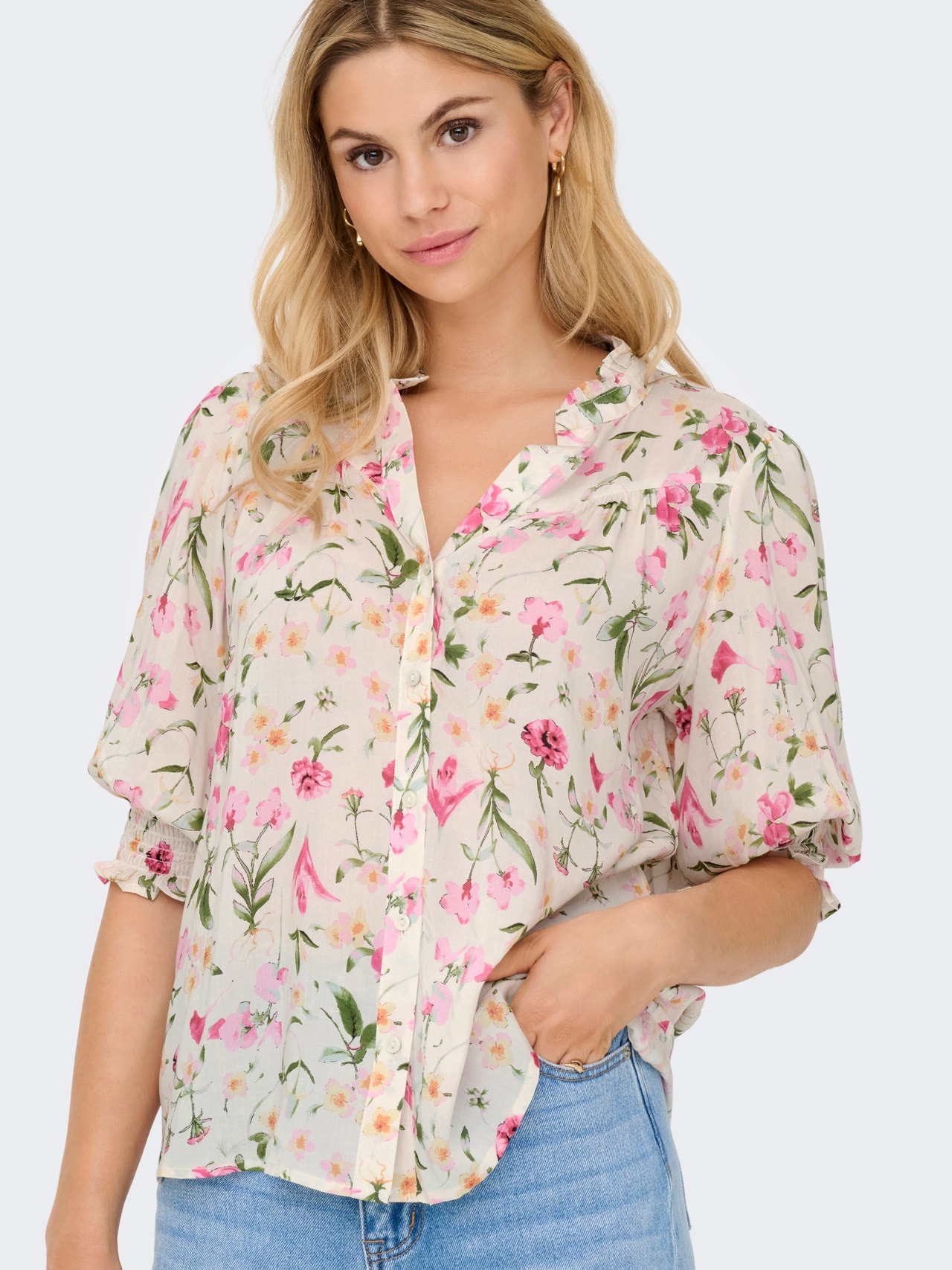 Bringe sanfte Farben und feine Details in deine Garderobe mit einer femininen Bluse, die sich leicht mit zeitlosen Jeans oder einem eleganten Rock kombinieren lässt.