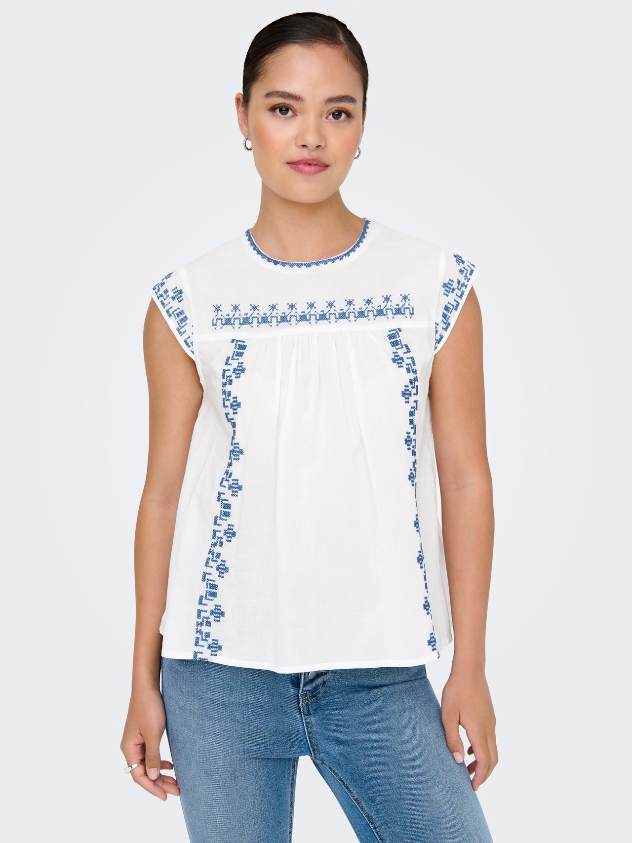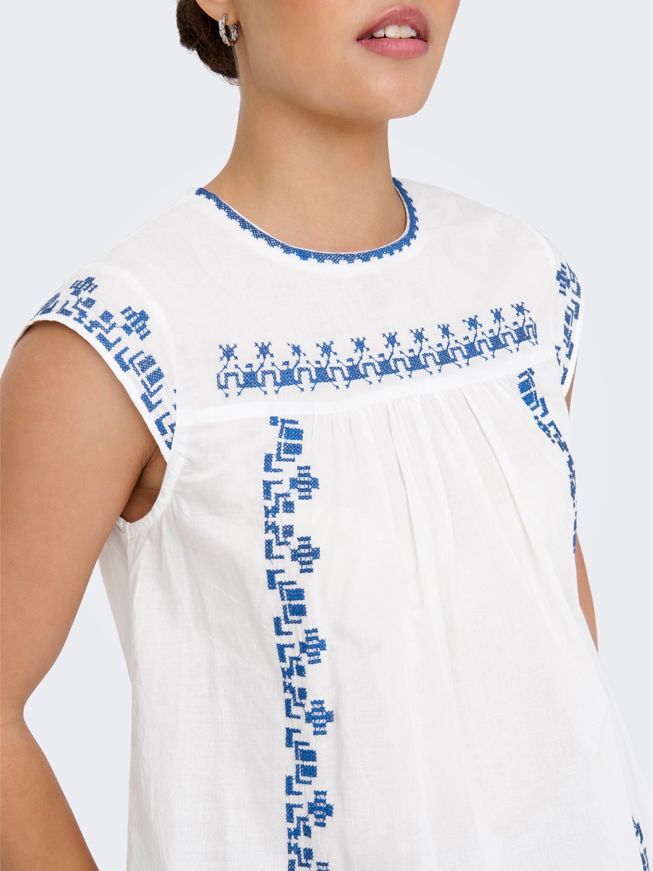 Verändere dein Alltagsoutfit in Sekundenschnelle, indem du mit einem femininen Oberteil einen weichen und schicken Akzent setzt. Baumwolle besteht aus natürlichen Fasern, die ein weiches, atmungsaktives Material bilden. - Produkttyp : Top - Hals : Rundhals - Ärmel : Ohne Ärmel - Verschluss : Knopfleiste - Details : Bestickt - Passform : Normal geschnitten