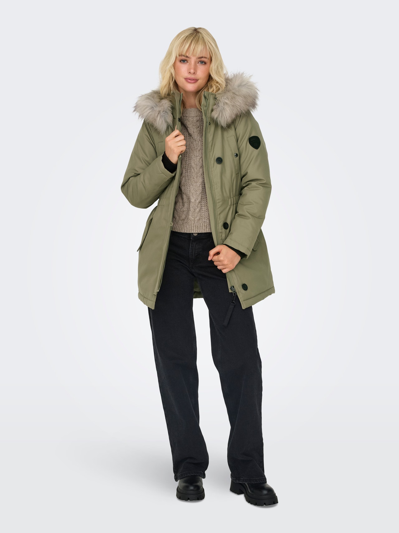 - λαιμόκοψης : Κουκούλα w. Αποσπώμενη άκρη συνθετικής γούνας