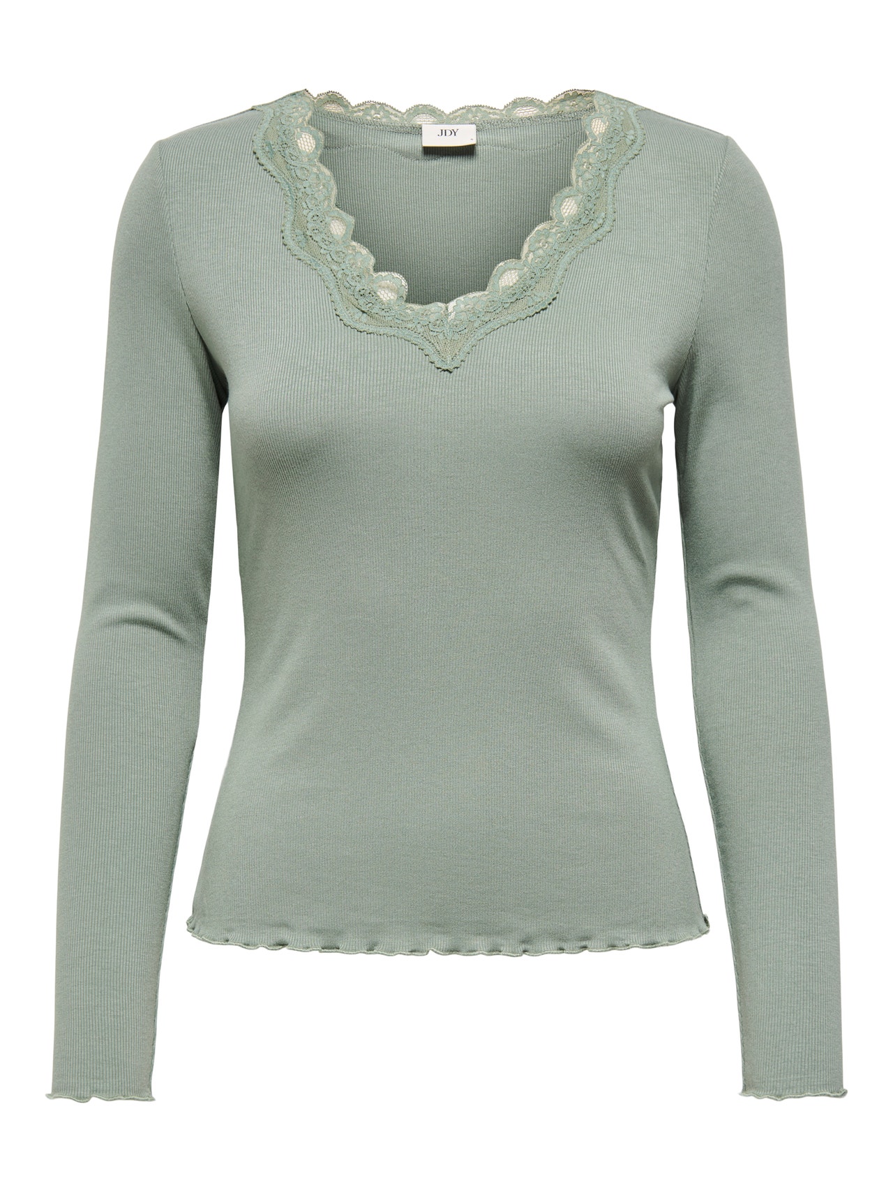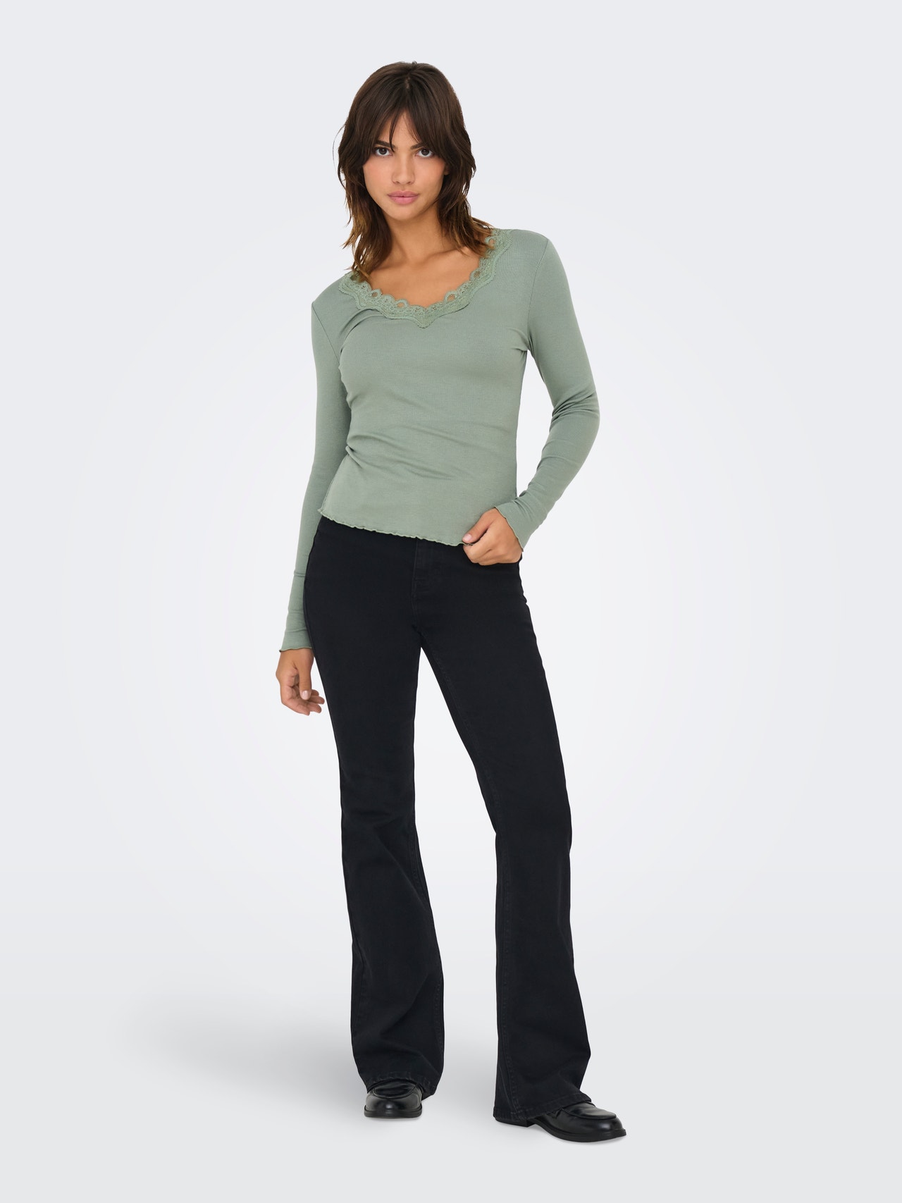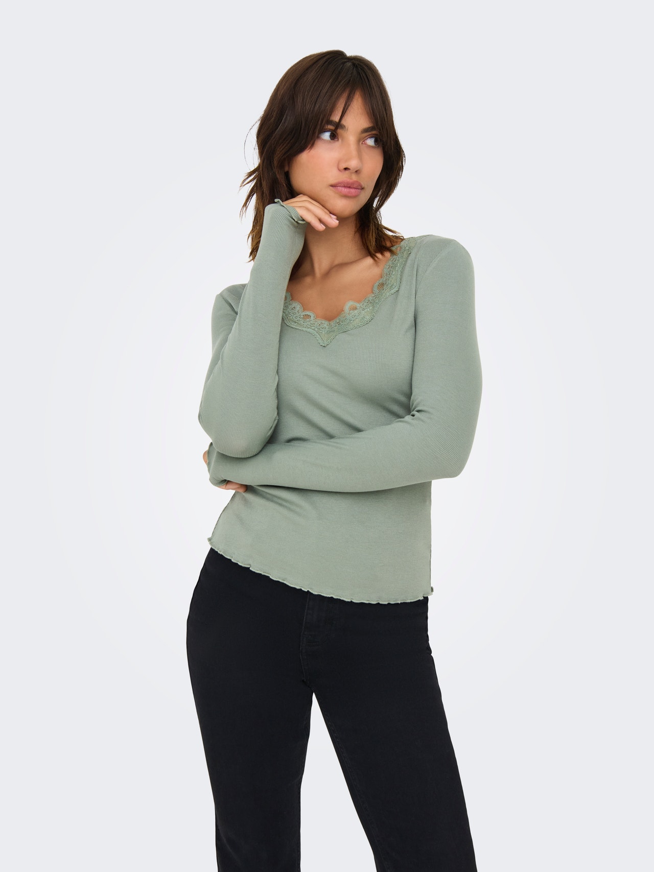 Change your everyday outfit in a second by adding a feminine top for a soft, clean expression. - Product Type : Top - Neck : V-Neck - Sleeve : Long sleeves - Cuffs : Elasticated cuffs - Extra details : Lace detail - Fit : Regular Fit