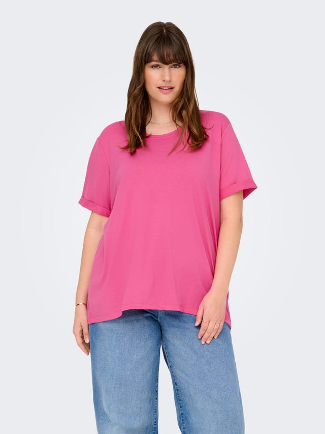 Graphic or plain, long-sleeved or short-sleeved, our collection of women’s plus size tops and T-shirts offers both comfort and figure-flattering style. Whether you prefer curve-hugging or body-skimming tops, they are a great way to add a pop of colour to your look or create a statement with a loud slogan. Layering is an easy trick to flatter your figure, just make sure that the under layer is tighter than the outer piece. Wear a longer plus size cardigan over a fitted logo T-shirt and pair it with a pair of faux leather trousers. Long-sleeved tops with lace detailing add a feminine touch to your lazy boyfriend jeans look over the weekend. For chilly days, layer your outfit with a plus size biker jacket and a wool beret as a finishing touch. Colour blocking has long been a huge trend seen not only on the catwalks but also in the streets. Look for tops with side panels that taper in toward the waist or tops with horizontal colour blocking where the above part is a different colour or print than the part below the waist. It’s all about emphasizing your silhouette!