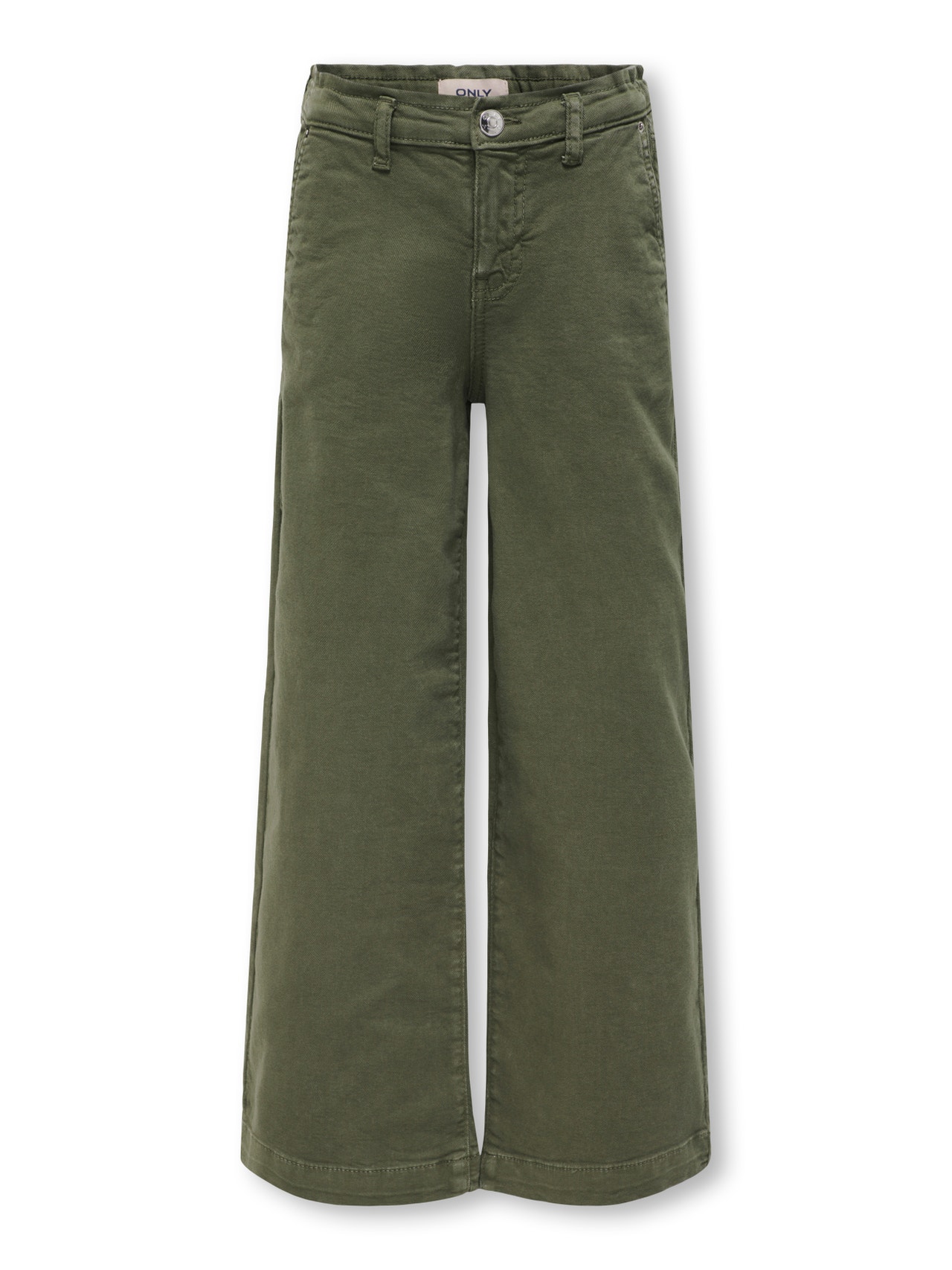 The trousers for girls from ONLY GIRLS combine comfort and style in the best way! From comfy leggings to trendy chinos, they are perfect for both play and school. Pair them with a simple T-shirt for a relaxed, yet trendy look that keeps comfort intact all day long. Cotton is made of natural fibres creating a soft, breathable fabric. ONLY GIRLS is for girls who love to express their style with confidence. The collections offer the perfect blend of trendy denim, feminine details, and rock ‘n’ roll-inspired styles. Our clothing is designed to give young fashion lovers the chance to stand out with both everyday looks and festive outfits. - Product Type : Wide-leg trousers - Closing : Button fastening - Pockets : Back pockets - Waist : Mid waist - Extra details : Belt loops - Fit : Cropped Fit - Attention : WARNING! Keep away from fire - Attachment comp : Cotton