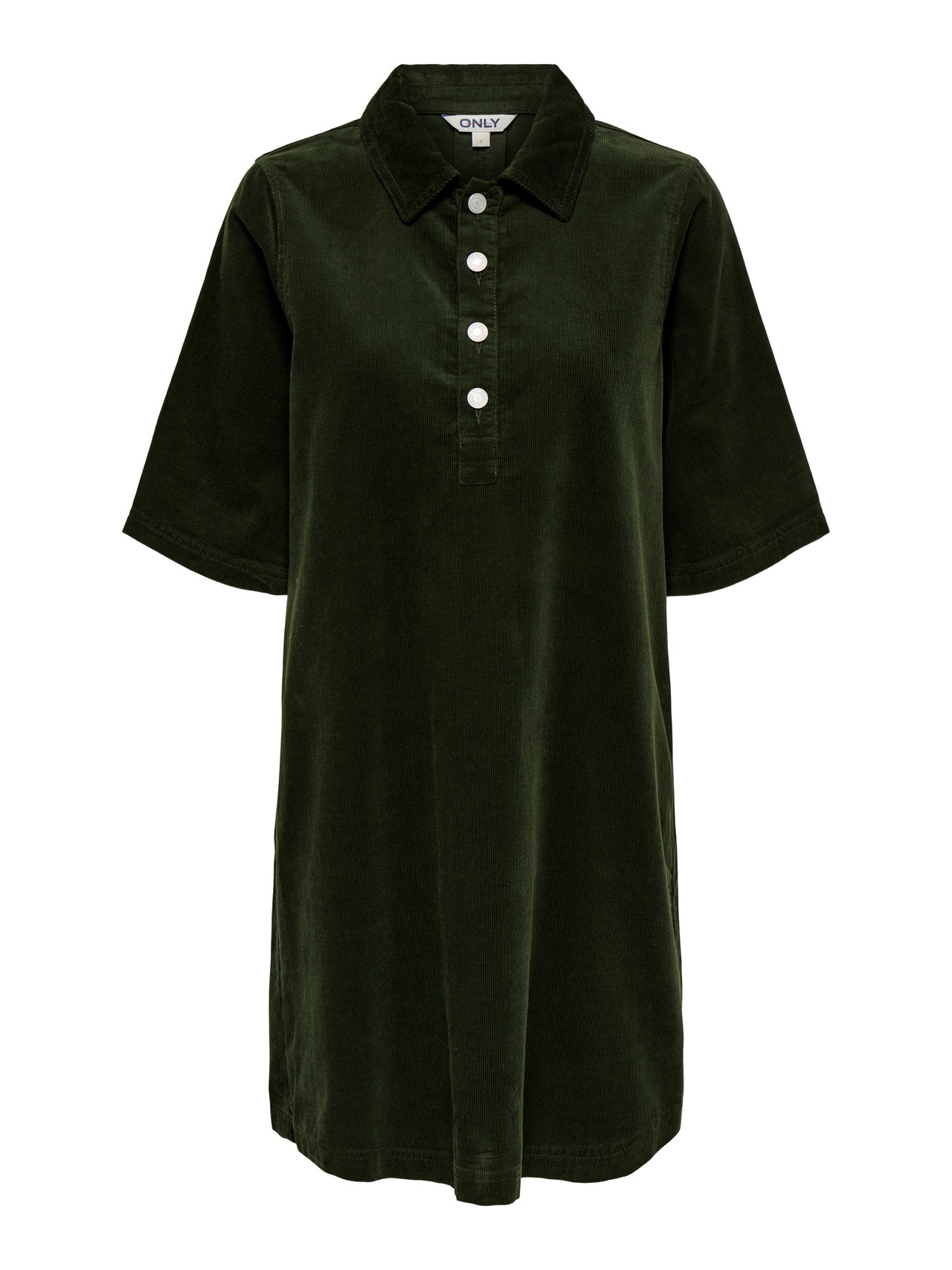 Get ready for work, school, or any other activity with an easy to style, everyday dress. Corduroy is a sturdier material known for its ridged and velvety surface which creates a soft feel and a timeless look. - Product Type : Dress - Neck : Shirt collar - Sleeve : Short sleeves - Closing : Button fastening - Fit : Oversize Fit