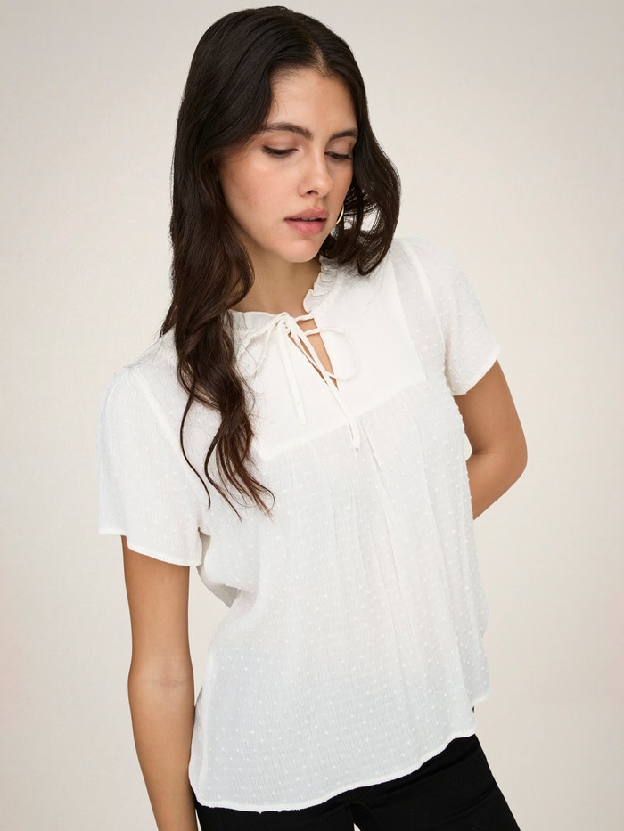 Change your everyday outfit in a second by adding a feminine top for a soft, clean expression.