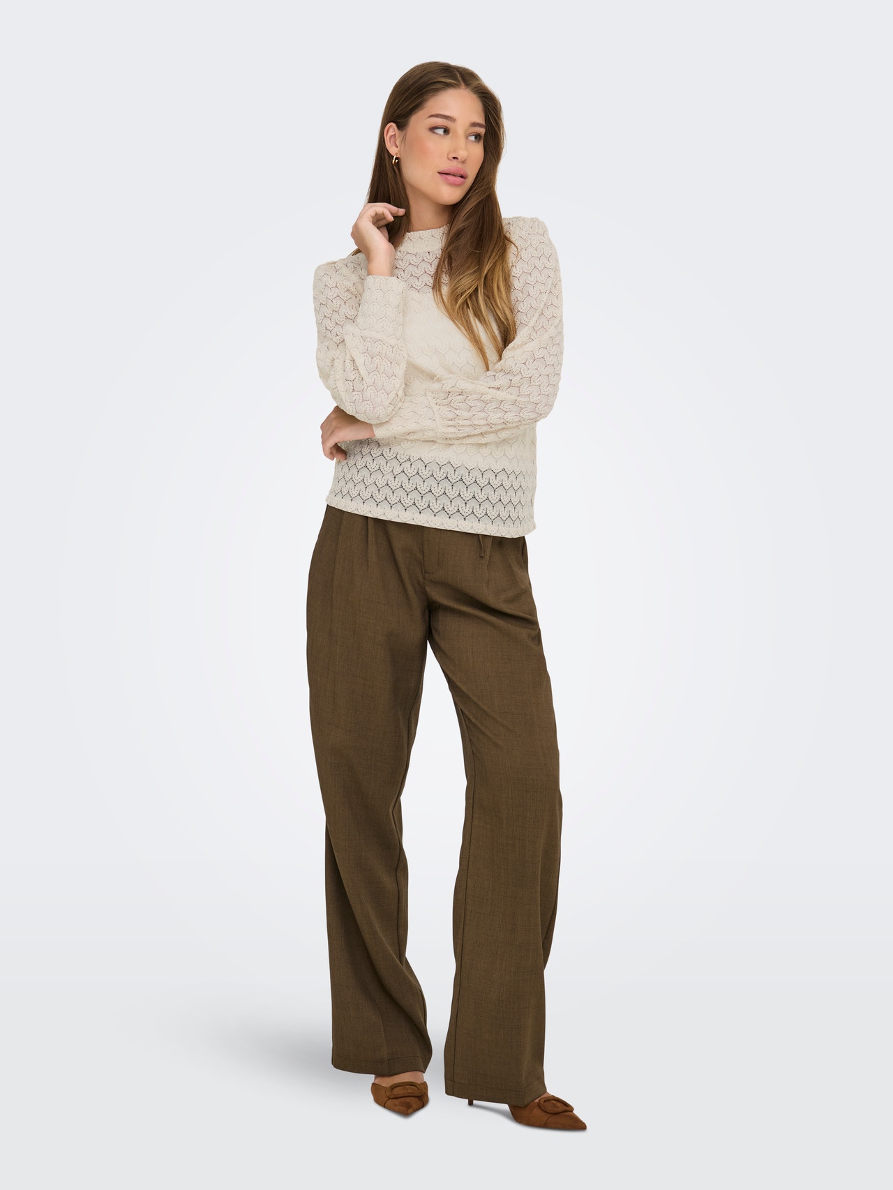 Change your everyday outfit in a second by adding a feminine top for a soft, clean expression.