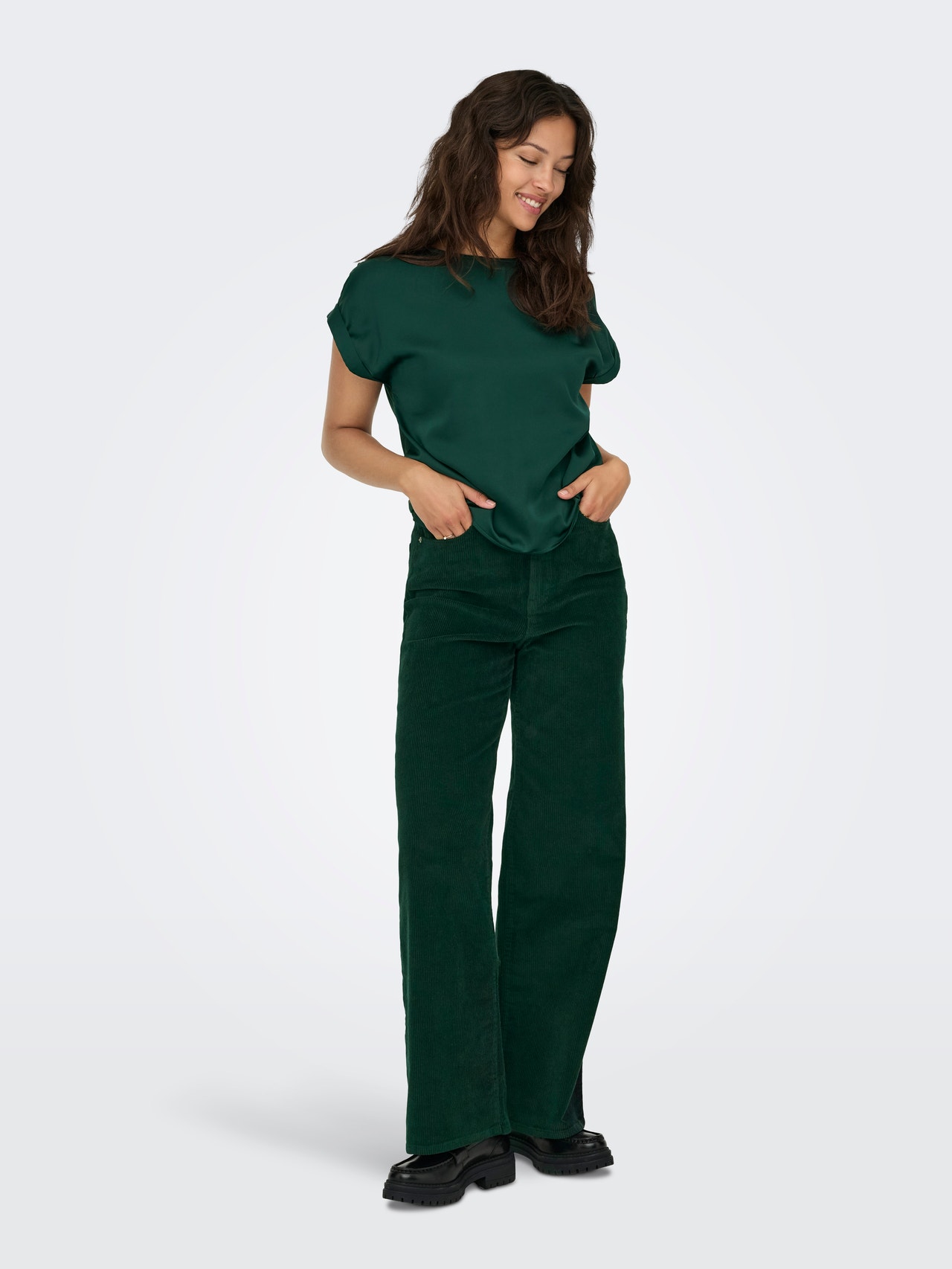 Change your everyday outfit in a second by adding a feminine top for a soft, clean expression.