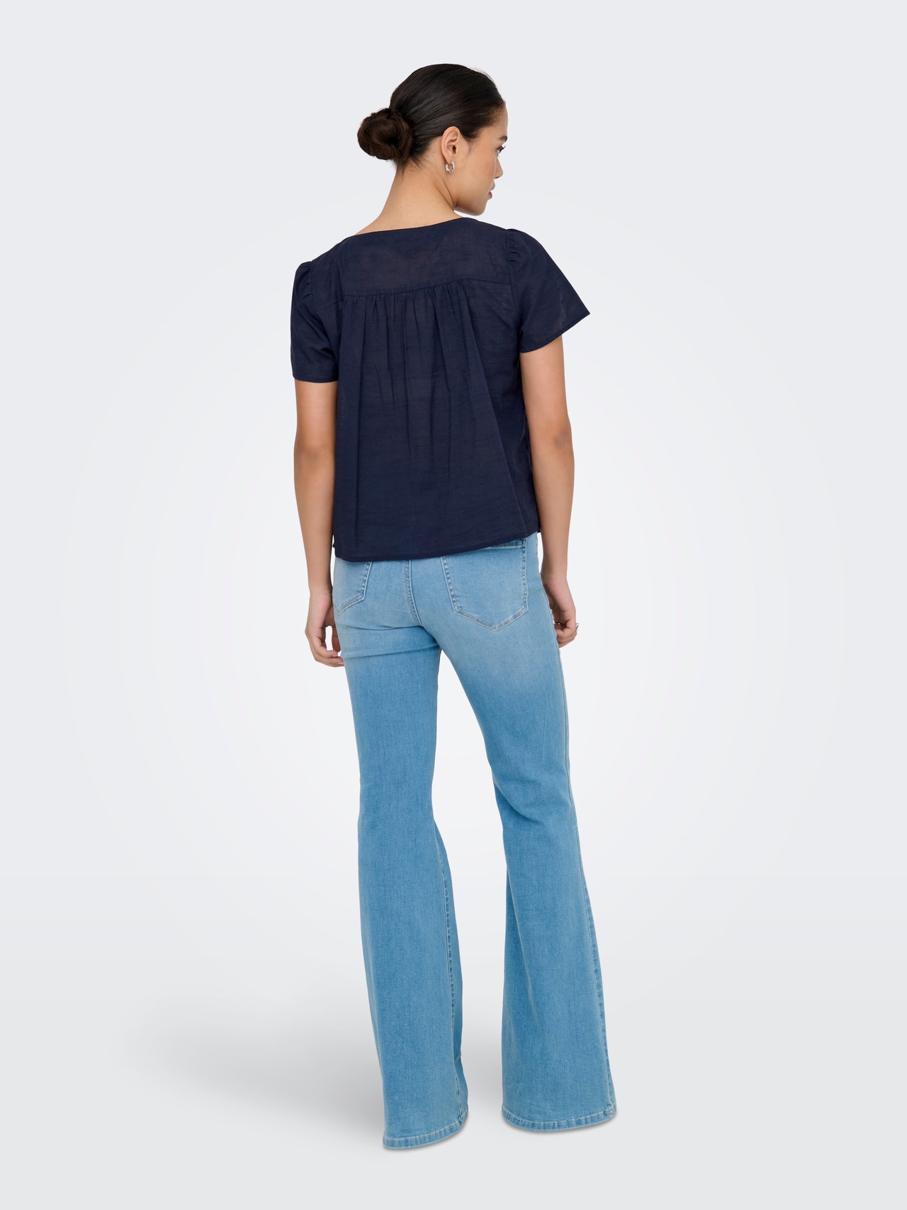 Change your everyday outfit in a second by adding a feminine top for a soft, clean expression.