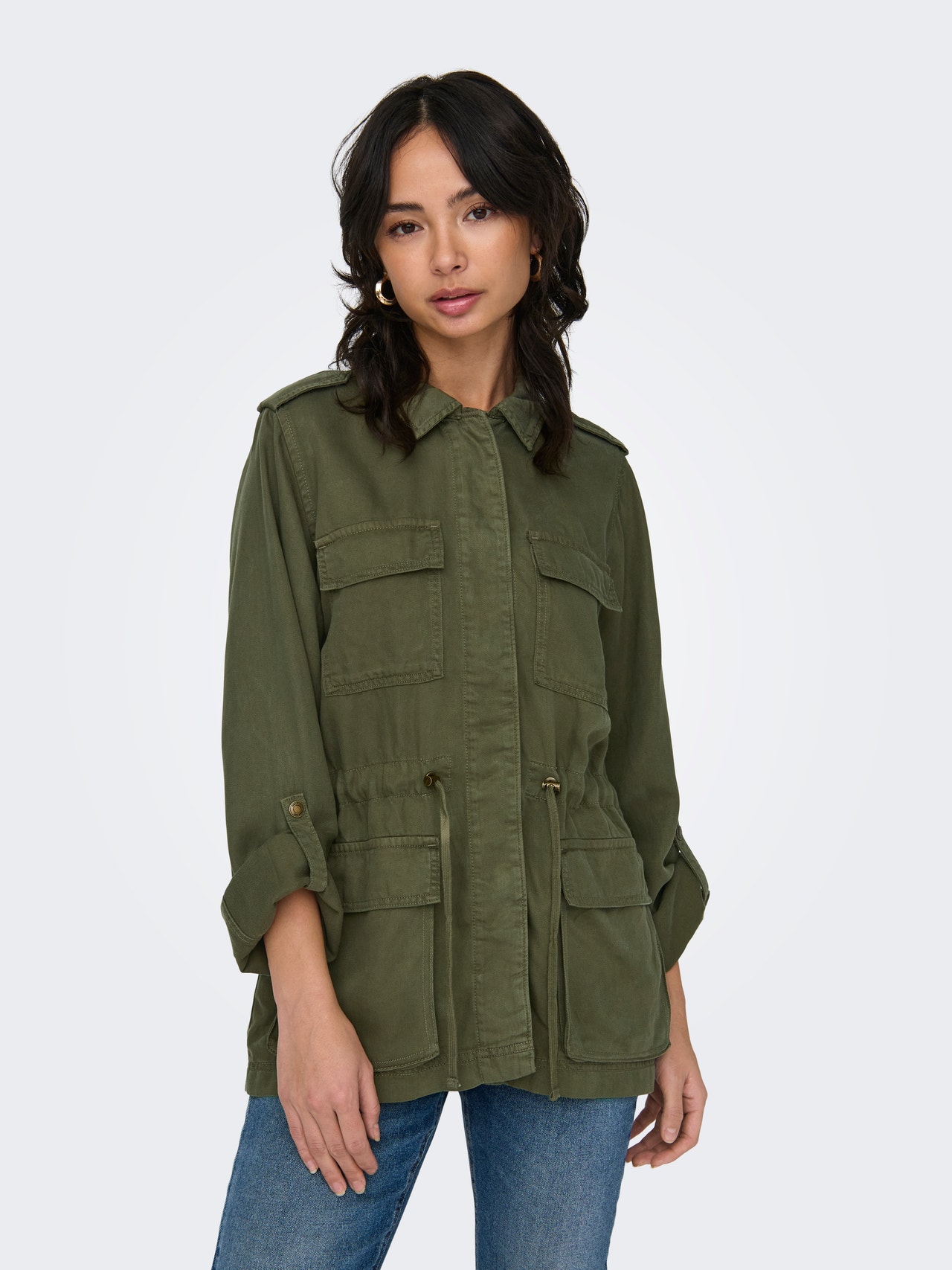 Make the season last longer with transitional outerwear and stay warm, comfortable, and stylish. - Product Type : Jacket - Neck : Spread collar - Sleeve : Long sleeves - Pockets : Front pockets - Extra details : Drawstring at waist