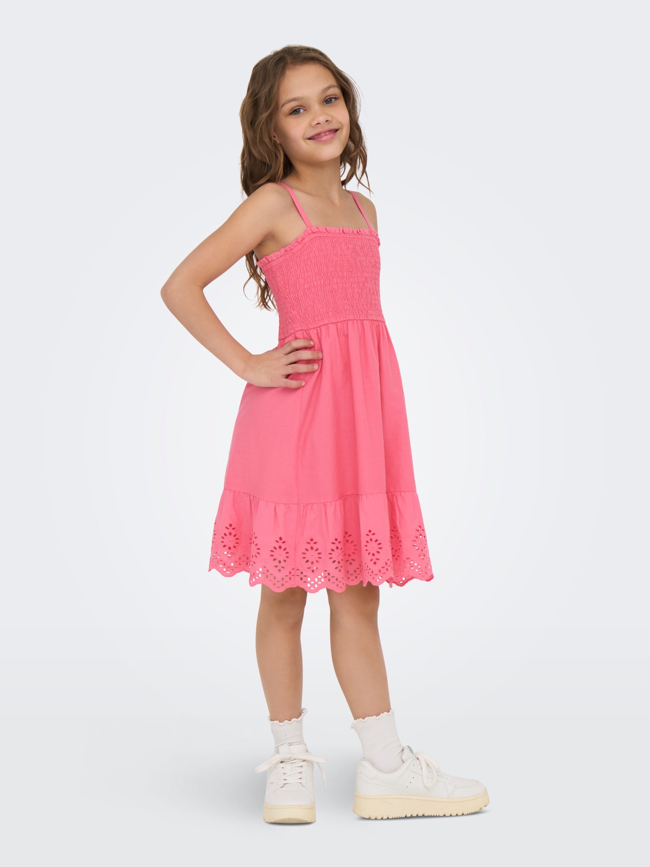 A cute and stylish upgrade with dresses from ONLY GIRLS! Perfect for both everyday wear and special occasions, from colourful casual dresses to pretty party dresses. Pair them with leggings and trainers for a look that combines comfort and personal style. ONLY GIRLS is for girls who love to express their style with confidence. The collections offer the perfect blend of trendy denim, feminine details, and rock ‘n’ roll-inspired styles. Our clothing is designed to give young fashion lovers the chance to stand out with both everyday looks and festive outfits. - Product Type : Dress - Neck : Square neck - Sleeve : Sleeveless - Straps : Thin straps - Length/Size : Midi length - Extra details : Embroidery, Smock detail - Fit : Slim Fit - Attention : WARNING! Keep away from fire