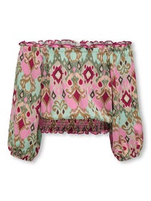 ¡Actualiza tu armario con tops coloridos y elegantes de ONLY GIRLS! Perfecto para usar en capas o como un top simple que se adapta a cualquier ocasión. Combínalos con pantalones cortos o jeans y zapatillas deportivas para un look relajado y moderno que ofrece mucha libertad de movimiento. - Artículo : Top - Cuello : De hombros descubiertos - Manga : Mangas 2/4 - Mangas : Mangas voluminosas - Puños : Puños elásticos - Detalles : Detalle fruncido - Corte : Corte regular - Atención : ¡ADVERTENCIA! Mantenga el artículo lejos del fuego.