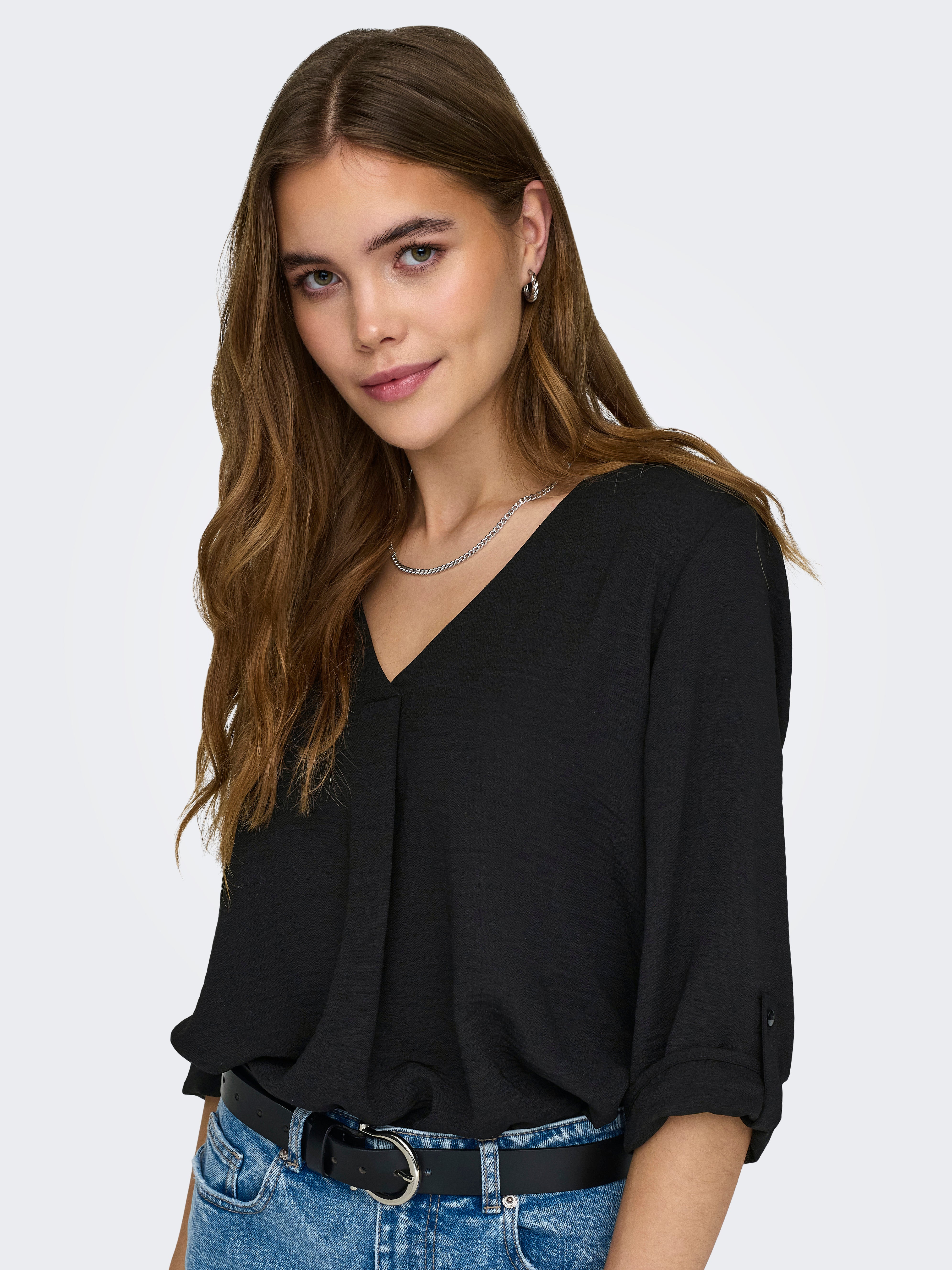 Ruumikas lõige V-kaelus Üles volditud mansetid Volüümikad varrukad Top
