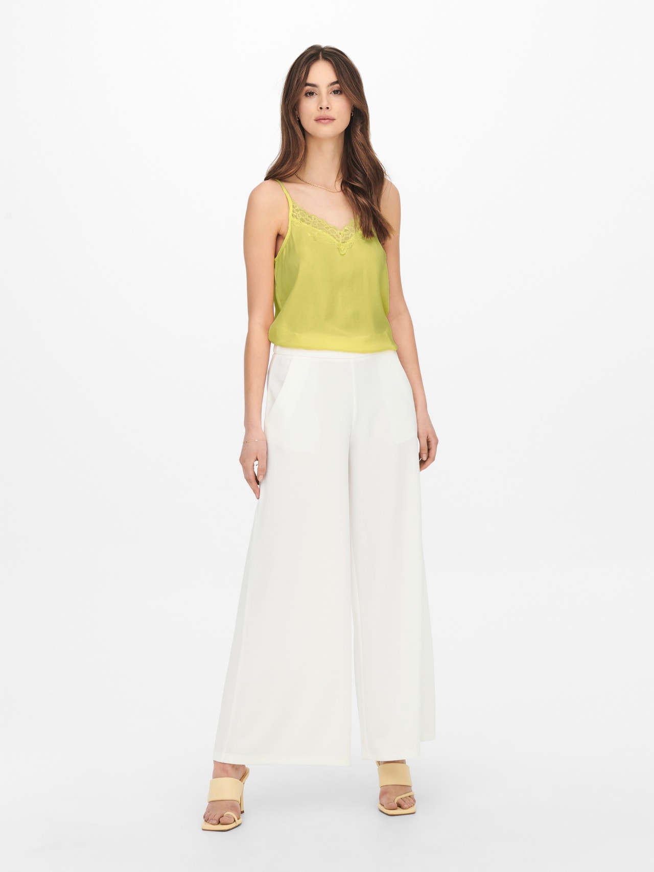Kootud kangad luuakse ajatu välimuse saavutamiseks kaht või enamat lõnga kokku põimides. JDY on täiskontseptsiooniga rahvusvaheline moebränd, mis pakub moeteadlikule tarbijale taskukohaseid ja trendikaid tooteid. - Toote tüüp : Topp - Kaelaosa : V-kaelus - Varrukas : Varrukateta - Täiendav info : Pitsdetail - Lõige : Tavapärane lõige