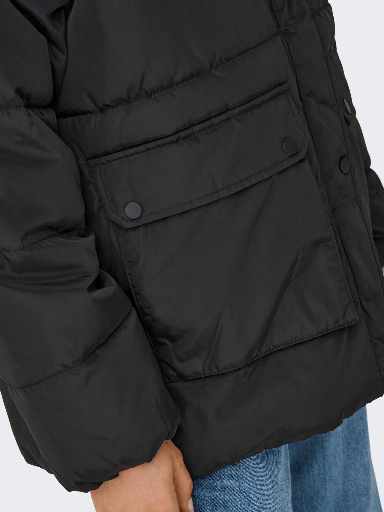 Hood with string regulation Cuffs with elastic binding Quilted Jacket