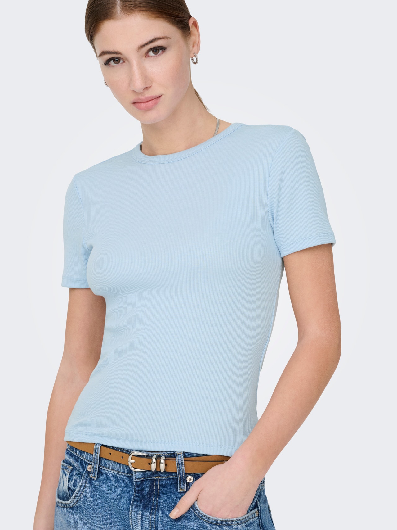 Tihedalt liibuv lõige Ümmargune kaelus T-särk