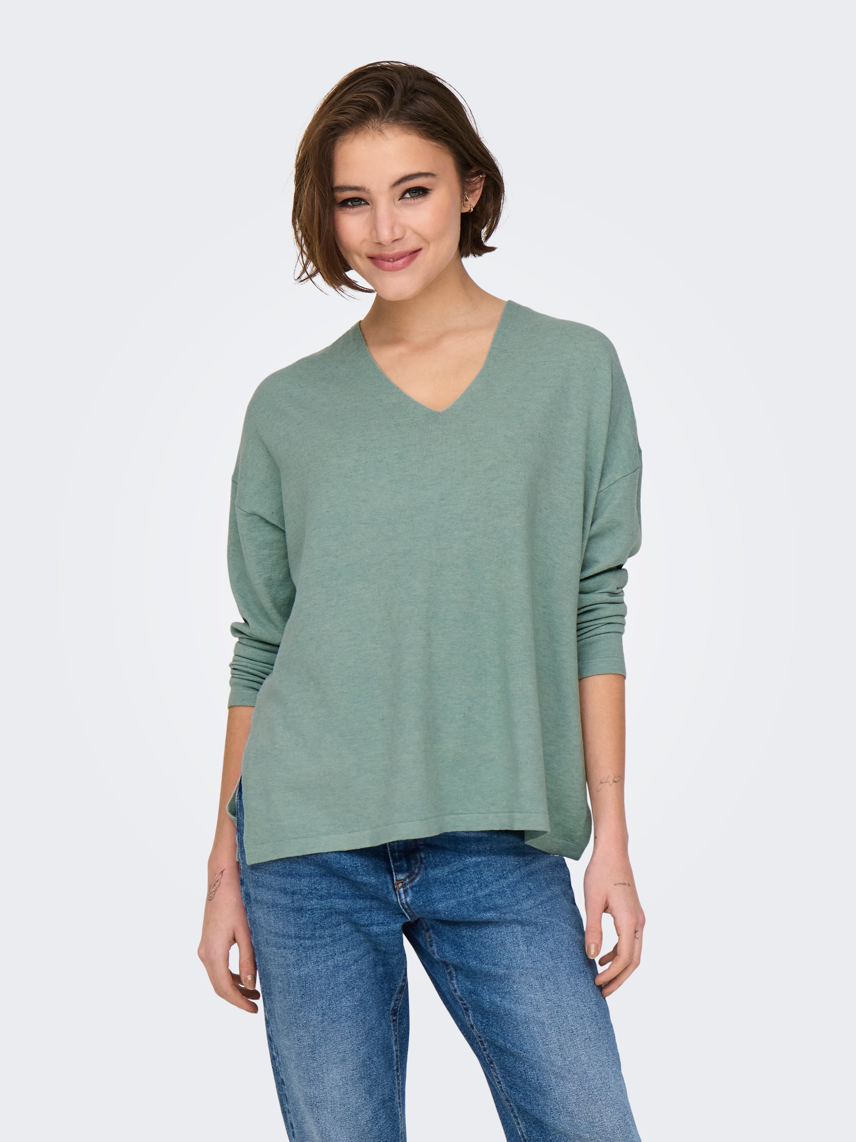 Väga suur lõige V-kaelus Soonikuga mansetid Langetatud õlaosa Pullover