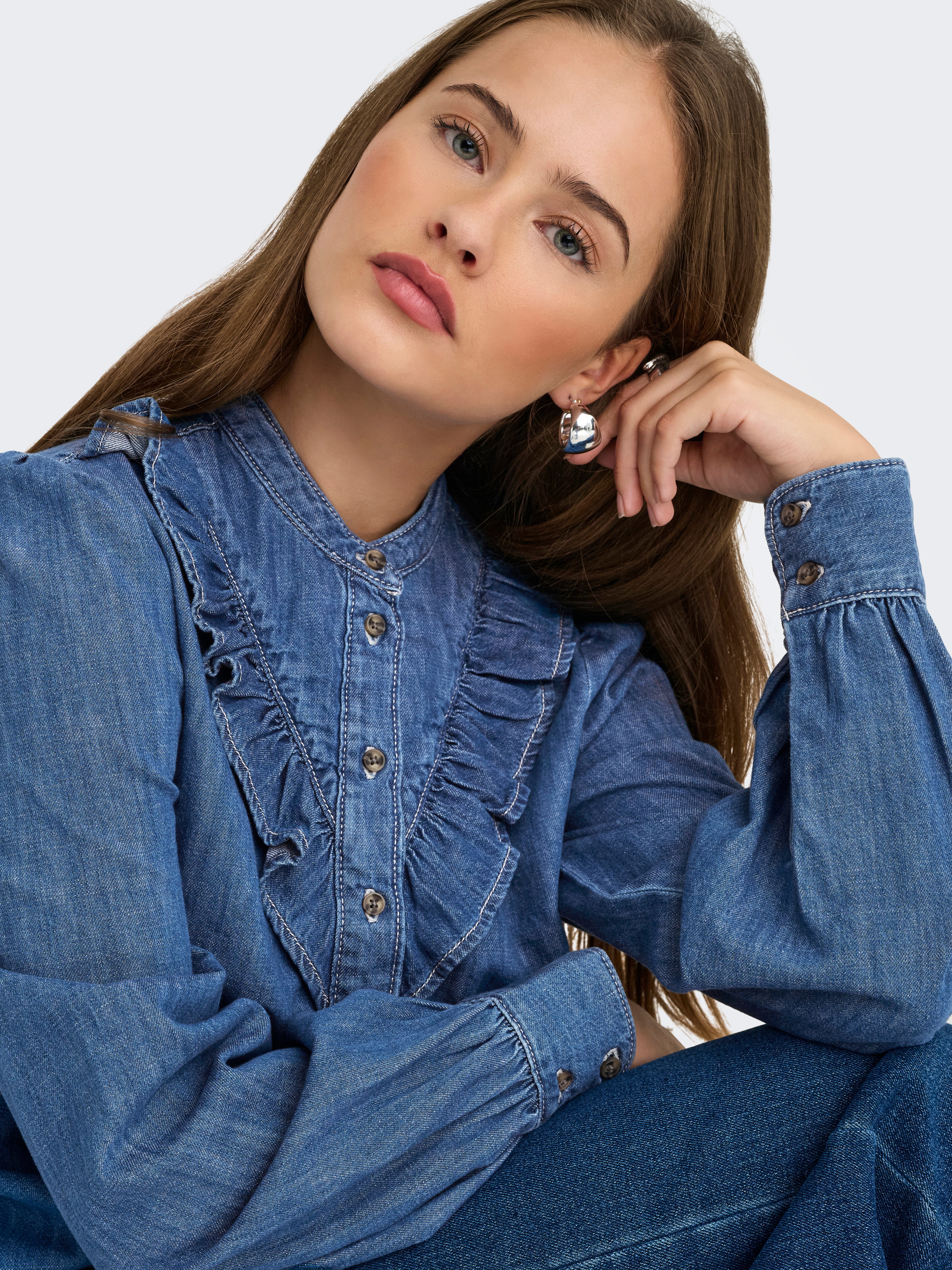 Tavapärane lõige Madal krae Kohandatavad nööpidega mansetid Balloonvarrukad Teksasärk