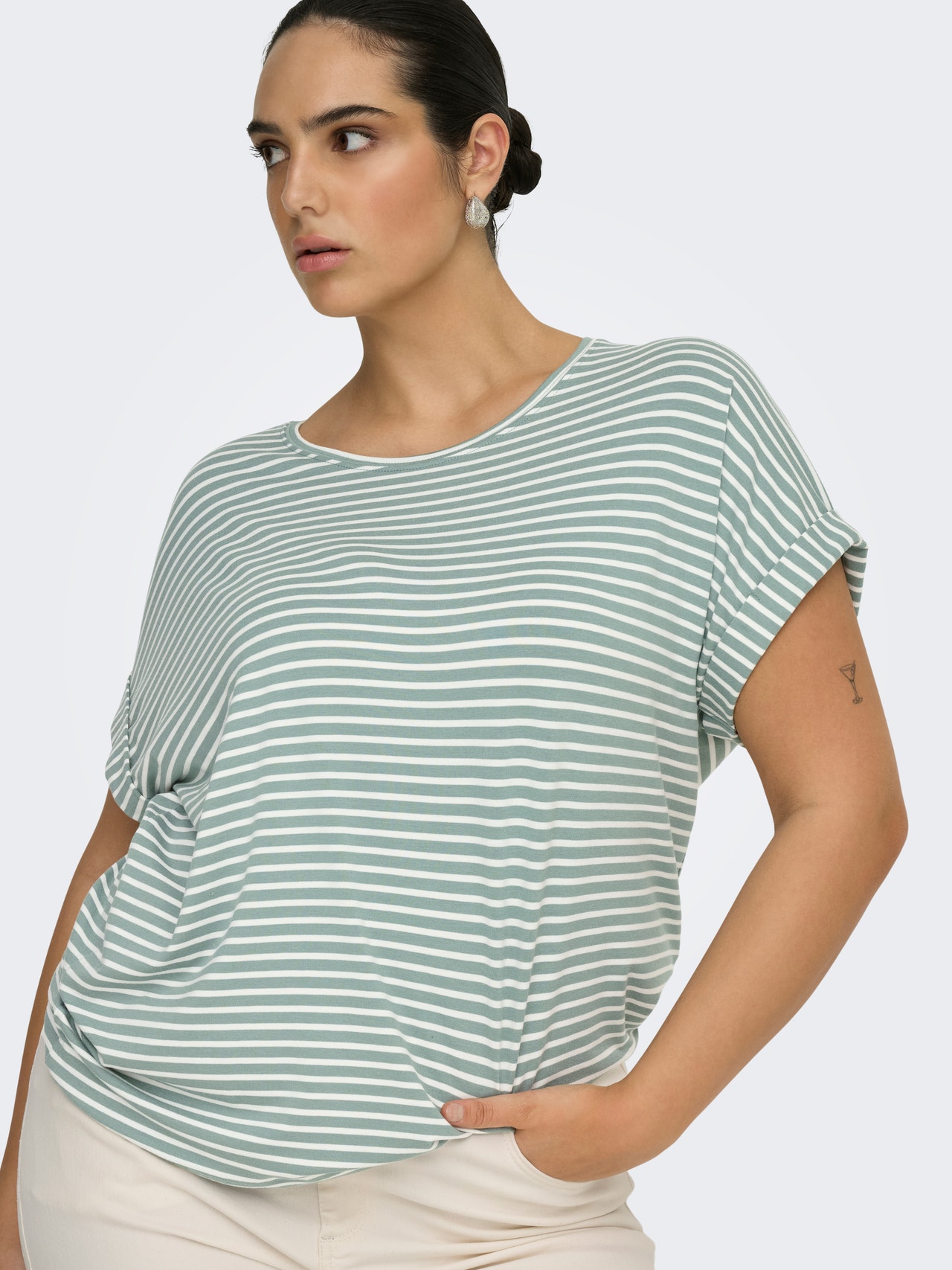 Tavapärane lõige Ümmargune kaelus Vormikas Üles volditud mansetid Langetatud õlaosa T-särk
