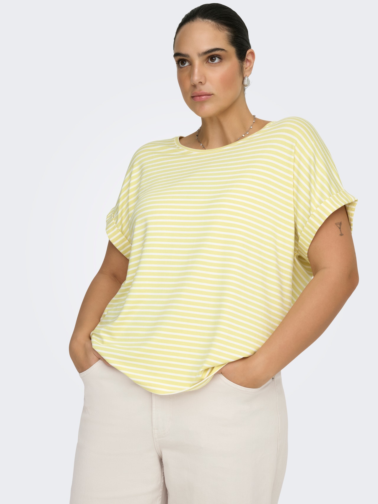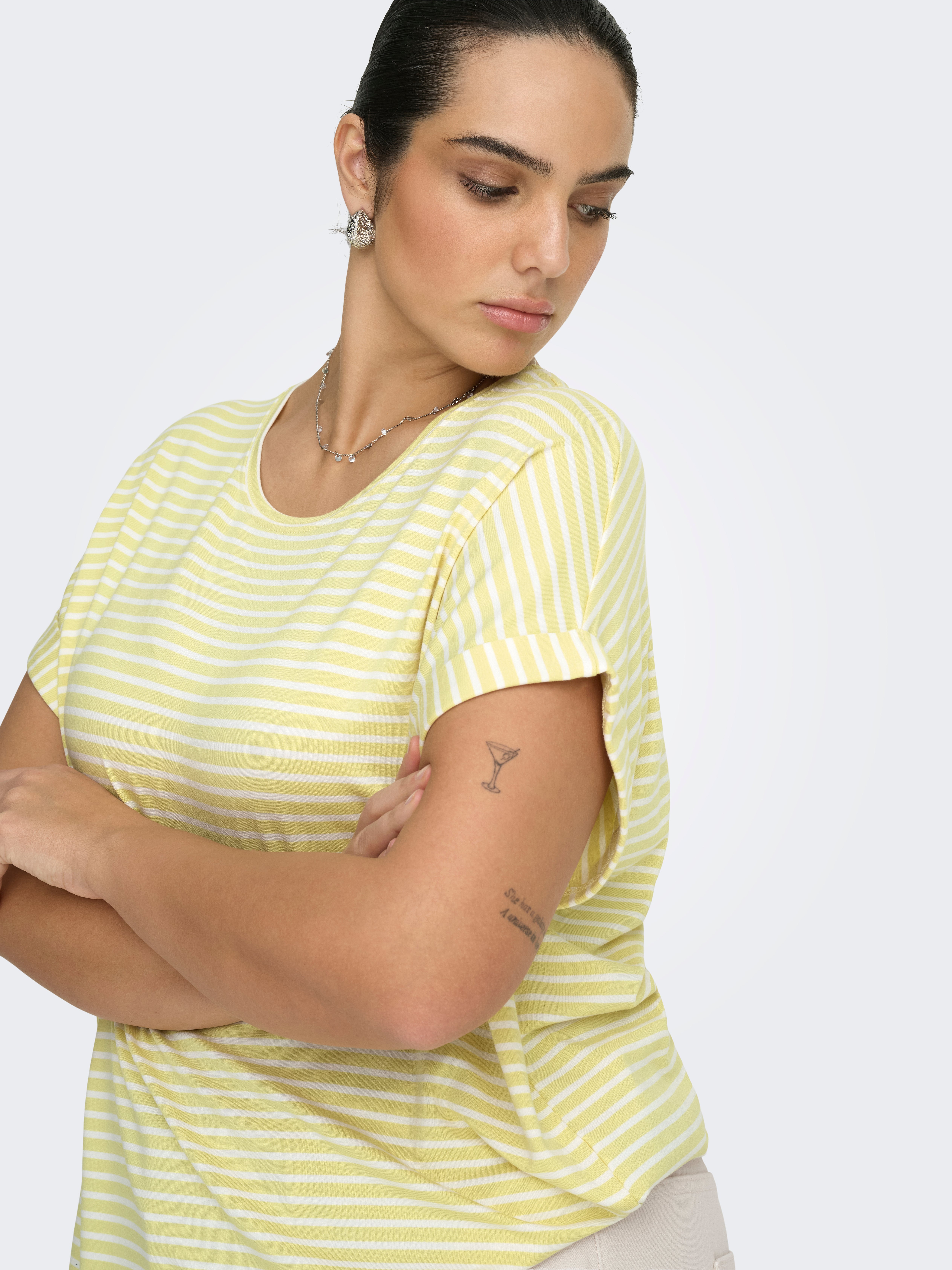 Tavapärane lõige Ümmargune kaelus Vormikas Üles volditud mansetid Langetatud õlaosa T-särk