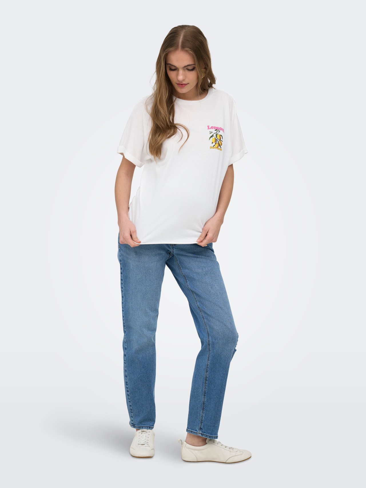 Tavapärane lõige Ümmargune kaelus Lapseootel naistele Eraldi lisatud varrukad T-särk