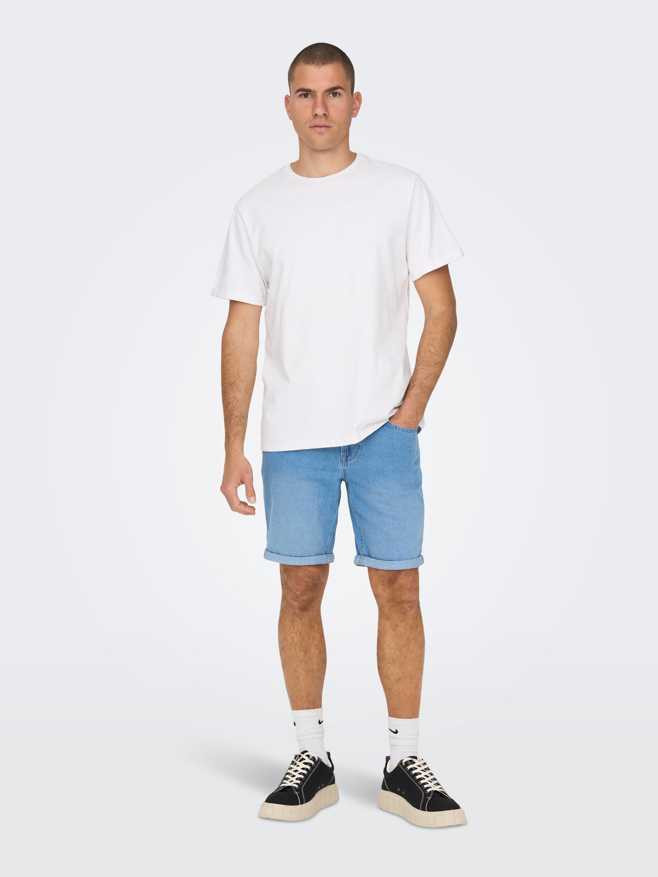 Hailing from the jeans world, 5 pockets got their name from the 2 rear pockets, 2 front pockets, and additional 5th coin pocket, placed inside the right front hip pocket. These shorts are normally reinforced by metal rivets, which all gives to the casual and practical appearance of 5 pockets. - Product Type : Denim shorts - Closing : Zip fly fastening - Pockets : Back pockets, Coin pocket, Front pockets - Waist : Regular rise - Length/size : Mid thigh - Extra details : Belt loops - Fit : Regular Fit