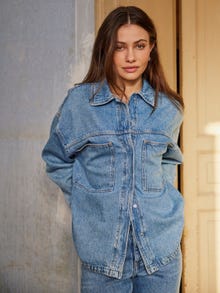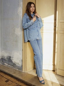 Step into the season's denim domination with our chic blue denim set, featuring a push-button long-sleeved shirt and high-waisted wide jeans, the quintessential ensemble for fashion-forward elegance.