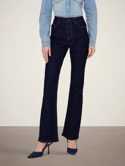- Coupes flared & bootcut. Deux coupes très proches, reconnaissables à leur évasement progressif à partir du genou. Le jean flare s'évase nettement dès le genou, tandis que le bootcut présente un bas de jambe plus discret, conçu à l'origine pour passer par-dessus des bottes. Inspirées par le denim vintage des années 70 et 90, ces pièces sont devenues des essentiels de la garde-robe moderne. Ils sculptent une silhouette chic et dynamique, sublimant le tombé sculptural du denim. Des lignes élancées sculptent une silhouette avantageuse, tandis qu'un évasement subtil équilibre les proportions avec un chic maîtrisé. Ces coupes séduisent tout particulièrement celles qui veulent un jean au caractère affirmé, sans sacrifier une silhouette équilibrée et flatteuse.