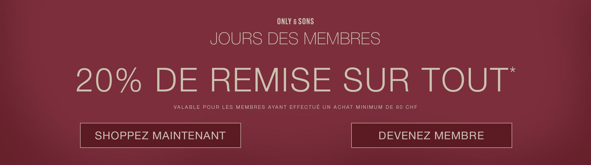 *Réservé aux membres jusqu’au 26/10/2025. Non cumulable avec d’autres réductions ou promotions. Valable pour les membres dès CHF 60 d’achat minimum. Offre valable sur une sélection de marques : CARMAKOMA, ONLY&SONS, JDY, ONLY MATERNITY, ONLY PLAY, ONLY MINI, ONLY GIRLS, ONLY&SONS JUNIOR