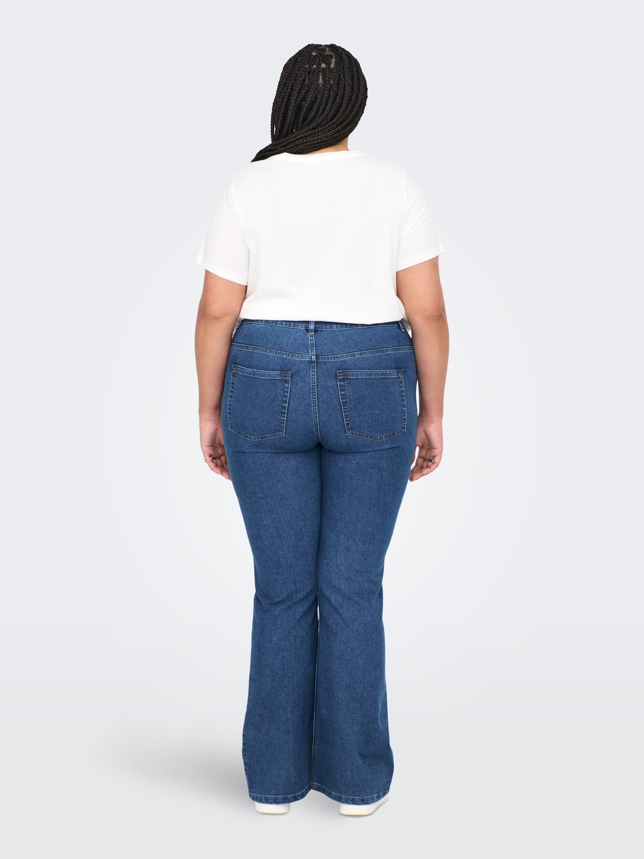 - Coupe : Jean curvy évasé, qui épouse les hanches et les cuisses et s'élargit à partir du genou