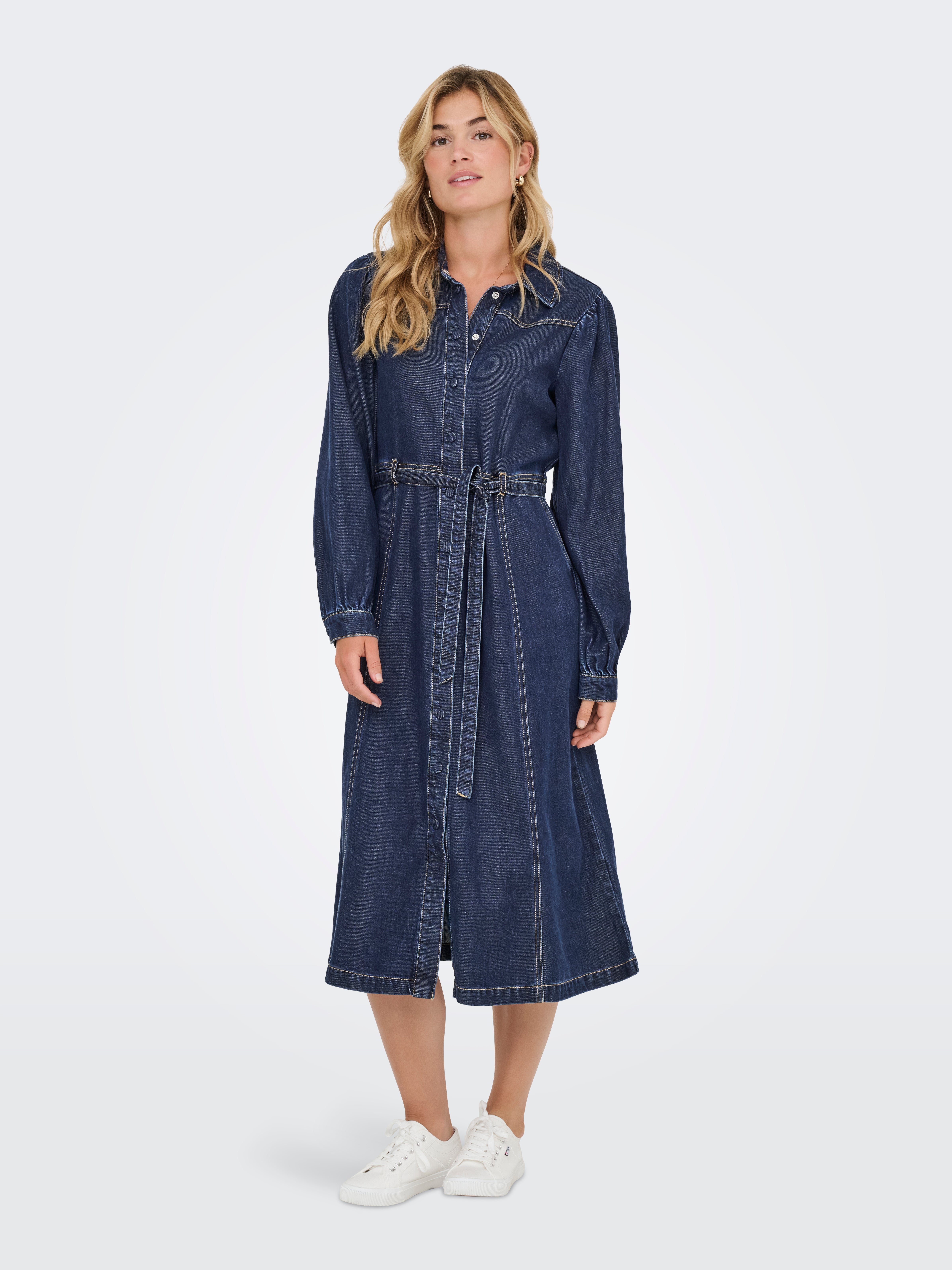 Sfoggia un look alla moda indossando un vestito in denim con un paio di scarpe da ginnastica e una giacca leggera in estate o in inverno con calze, stivali e un capo in maglia per un look deciso.