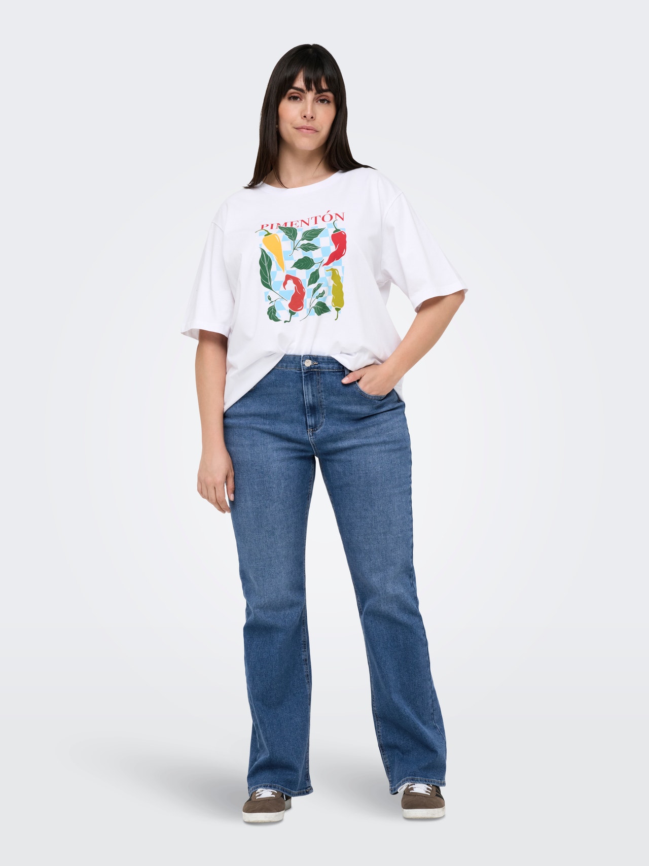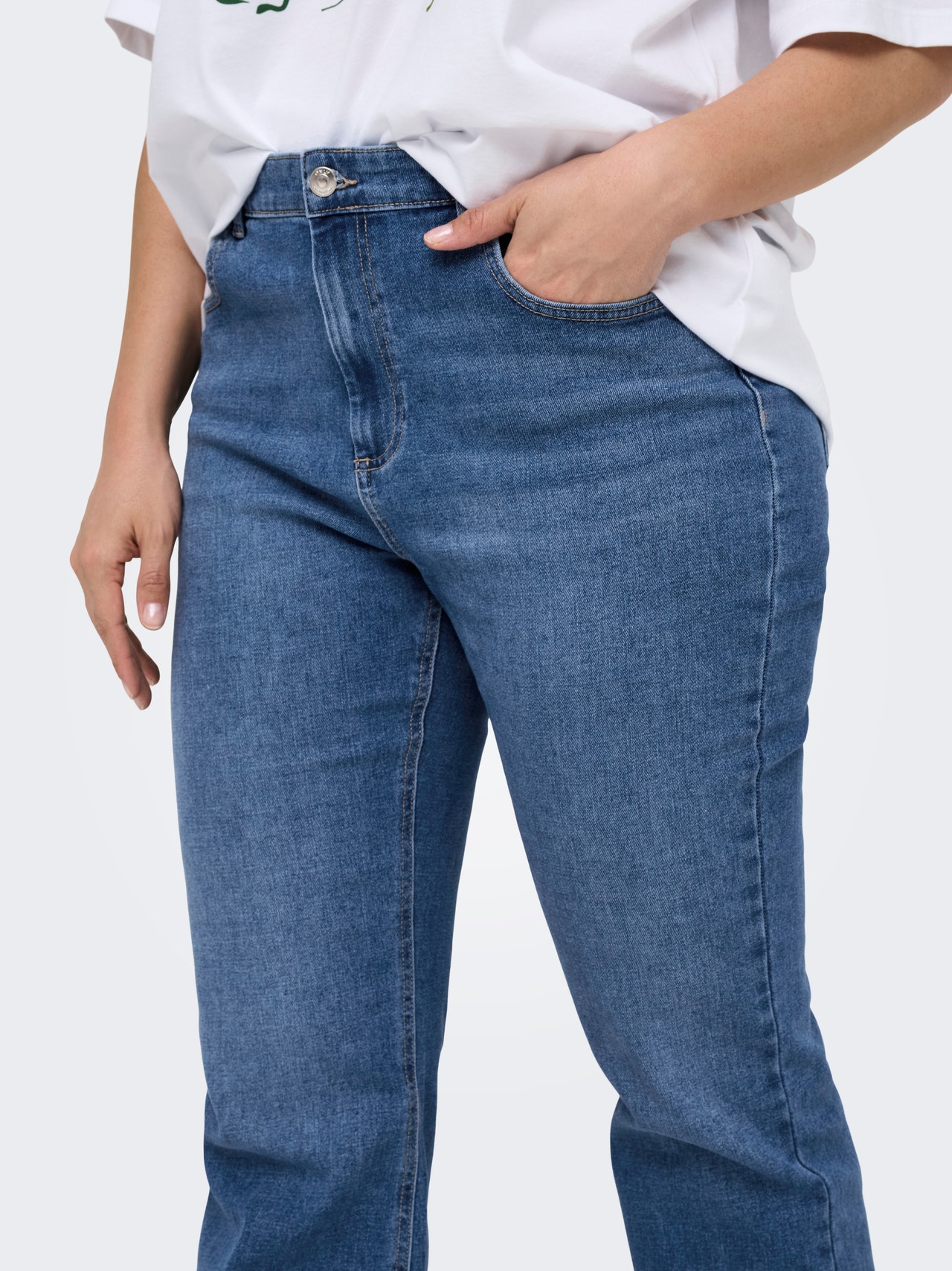 Aggiungi un tocco in più al tuo outfit con i nostri jeans a zampa taglie forti, che combinano il comfort con un taglio elegante che allunga le gambe. Il design presenta un'altezza della vita lusinghiera e un'apertura della gamba leggermente svasata, creando una silhouette bella e femminile. Il morbido denim elasticizzato offre libertà di movimento per tutto il giorno. Perfetto sia per i look di tutti i giorni che per le occasioni più festive.