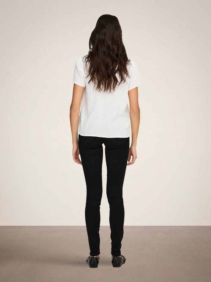 Pakeiskite savo kasdienę aprangą akimirksniu, pridėdami moterišką viršutinę dalį, kad išraiška būtų švelni ir švari.