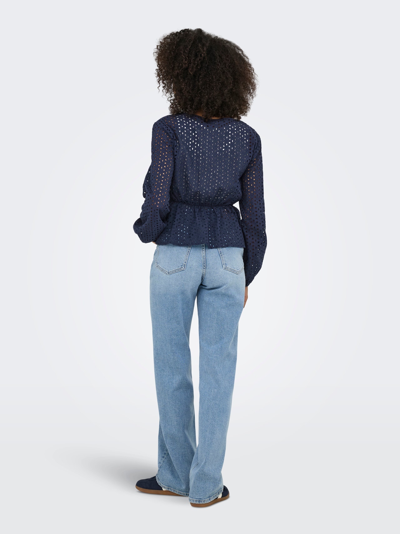 Pakeiskite savo kasdienę aprangą akimirksniu, pridėdami moterišką viršutinę dalį, kad išraiška būtų švelni ir švari. - Produkto tipas : Peplumo marškinėliai - Kaklas : V formos apykaklė - Rankovė : 7/8 rankovės - Rankogaliai : Sagomis užsegami rankogaliai - Užsegimas : Užsegimas virvelėmis - Papildomos detalės : Broderie anglaise detalė - Tinkamas : Klasikinis kirpimas