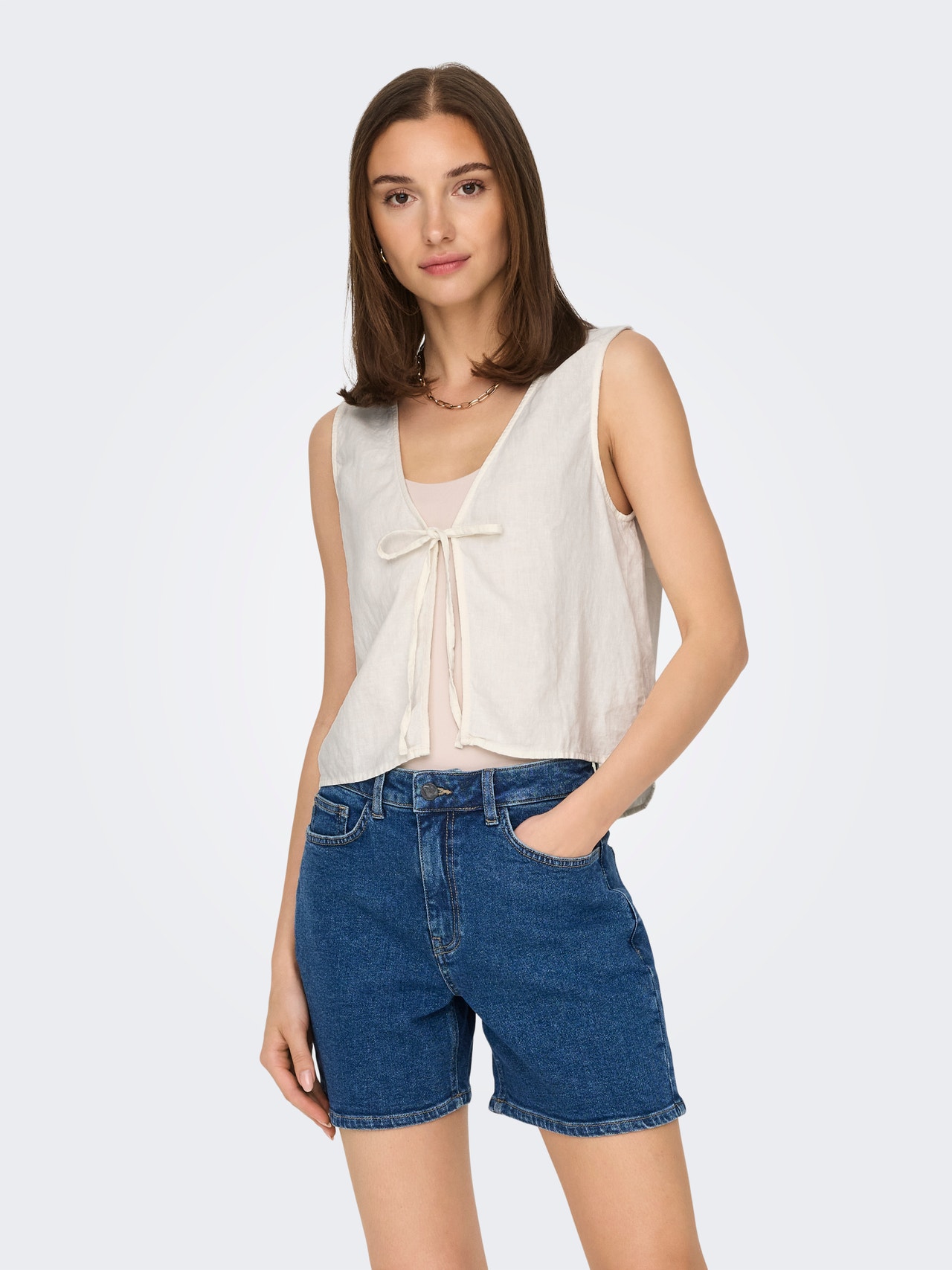 Pakeiskite savo kasdienę aprangą akimirksniu, pridėdami moterišką viršutinę dalį, kad išraiška būtų švelni ir švari.