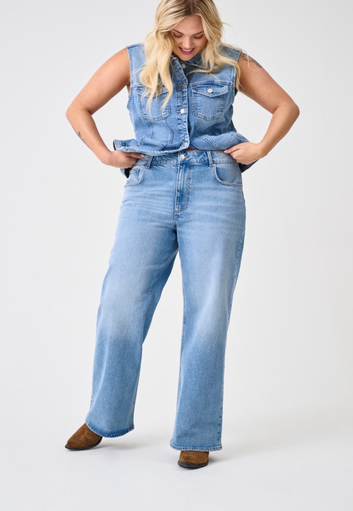 Mūsų plius dydžio plačiai prigludę džinsai siūlo maksimalų komfortą ir rafinuotą išvaizdą plačiomis kojomis ir aukštu juosmeniu. Prigludimas sukurtas taip, kad leistų oro srautui ir judėjimo laisvei, tuo pačiu sukuriant atsipalaidavusį ir elegantišką siluetą. Audinys turi daug tempimo, todėl džinsus patogu dėvėti visą dieną. Puikiai tinka tiems, kurie nori modernios ir kasdienės išvaizdos.