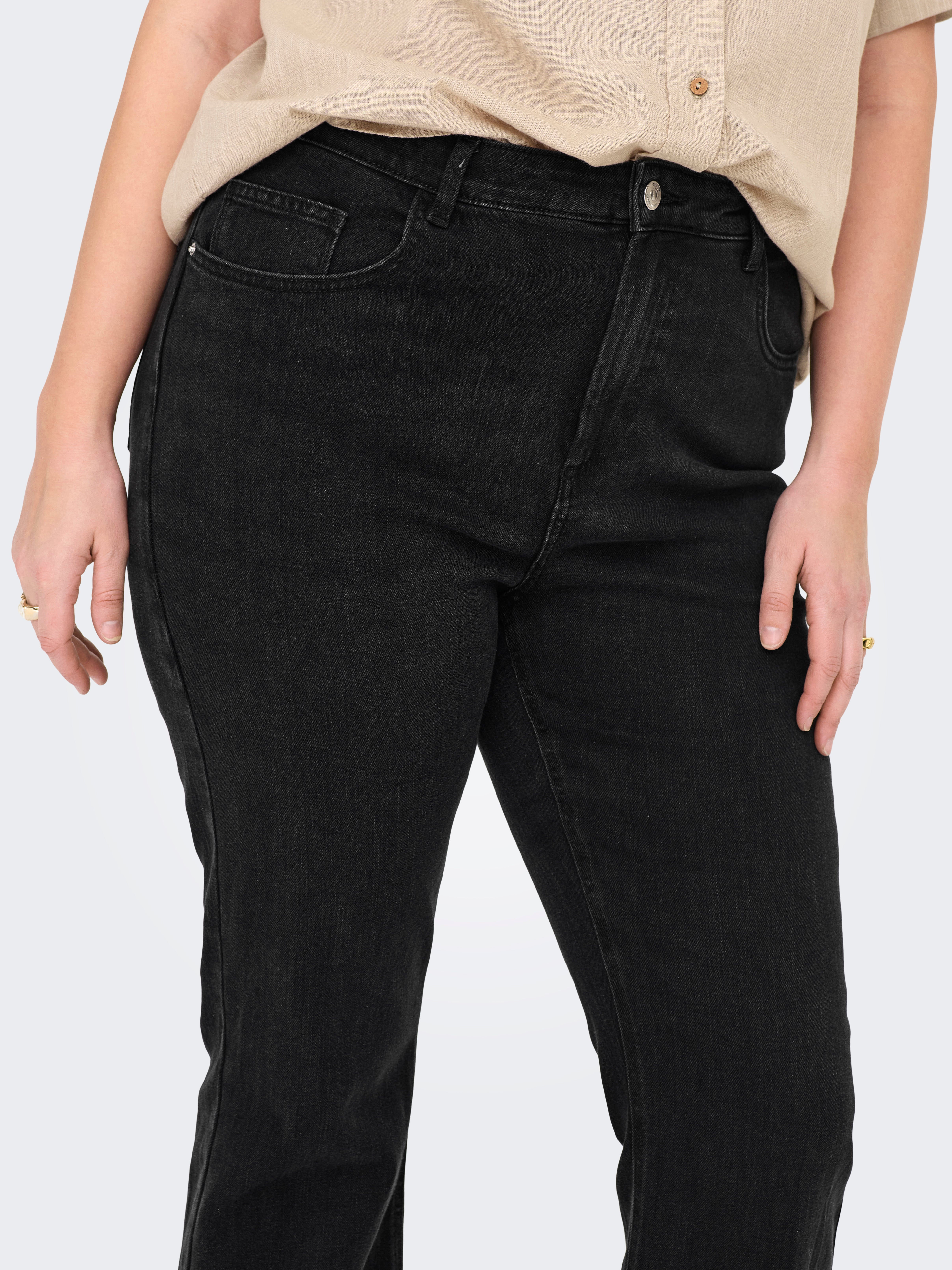 Pridėkite papildomą kraštą prie savo aprangos su mūsų plius dydžio platėjančiais džinsais, derindami patogumą su stilingu, kojas ilginančiu kirpimu. Dizainas pasižymi glostančiu juosmens aukščiu ir šiek tiek platėjančia kojų anga, sukuriančia gražų ir moterišką siluetą. Minkštas tampris džinsinis audinys suteikia judėjimo laisvę visą dieną. Puikiai tinka tiek kasdienei išvaizdai, tiek šventiškesnėms progoms.