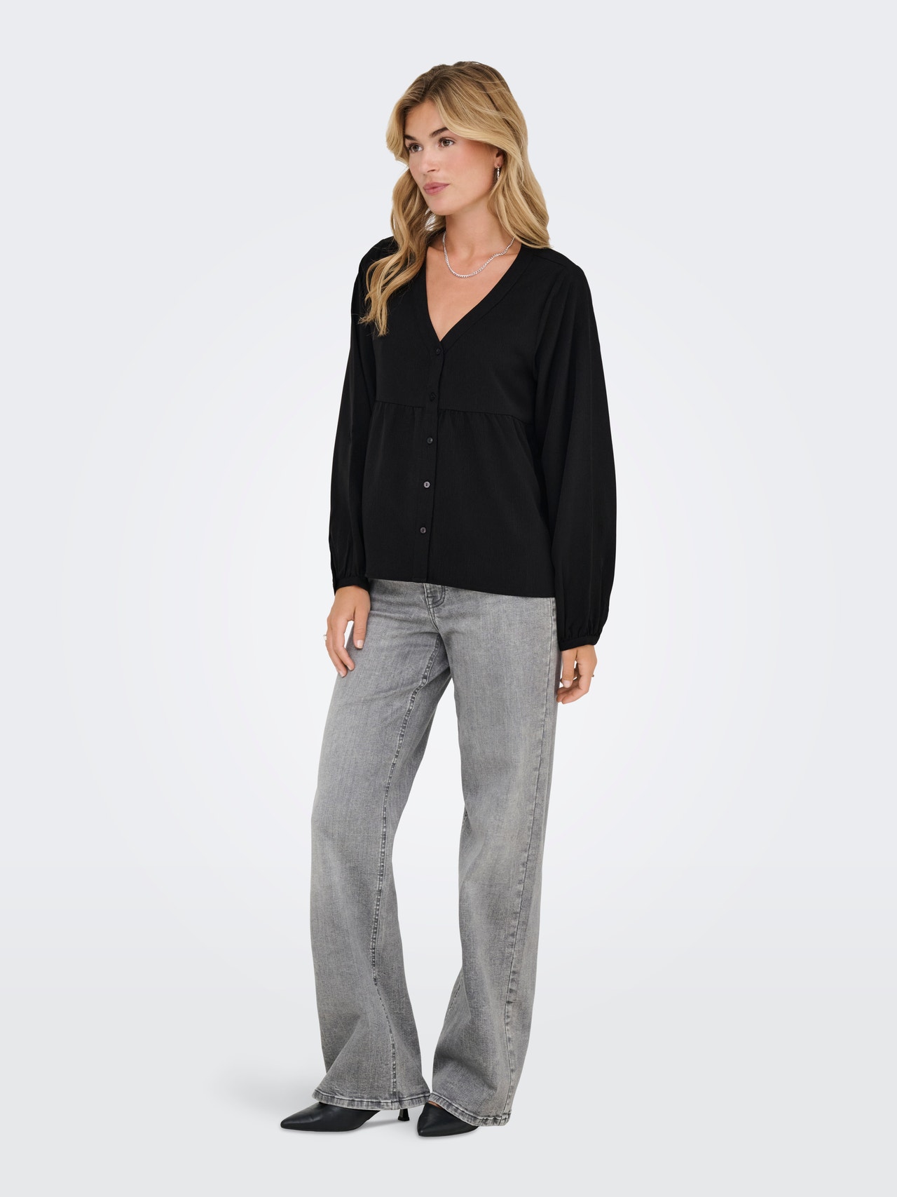 Pakeiskite savo kasdienę aprangą akimirksniu, pridėdami moterišką viršutinę dalį, kad išraiška būtų švelni ir švari. - Produkto tipas : Palaidinės - Kaklas : V formos apykaklė - Rankovė : Ilgos rankovės - Rankovės : Baliono formos rankovės - Užsegimas : Užsegimas sagomis - Tinkamas : Klasikinis kirpimas
