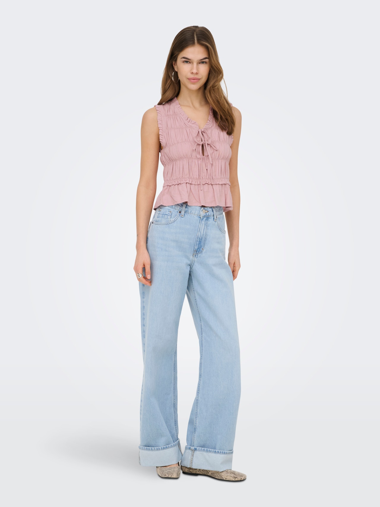 Pakeiskite savo kasdienę aprangą akimirksniu, pridėdami moterišką viršutinę dalį, kad išraiška būtų švelni ir švari.
