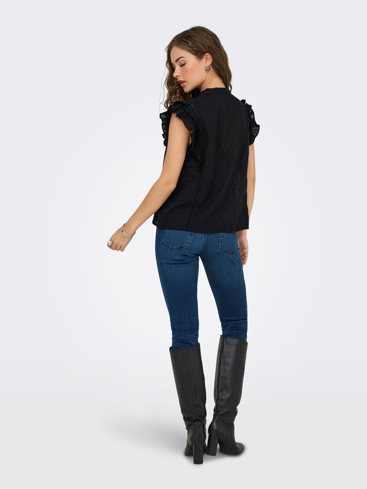 Pakeiskite savo kasdienę aprangą akimirksniu, pridėdami moterišką viršutinę dalį, kad išraiška būtų švelni ir švari.