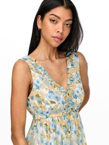 LDS WVN DRESS WITH DEEP BACK A DEEP V-NECK. FRILL DETAIL IN NECK. ELASTIC IN WAIST.