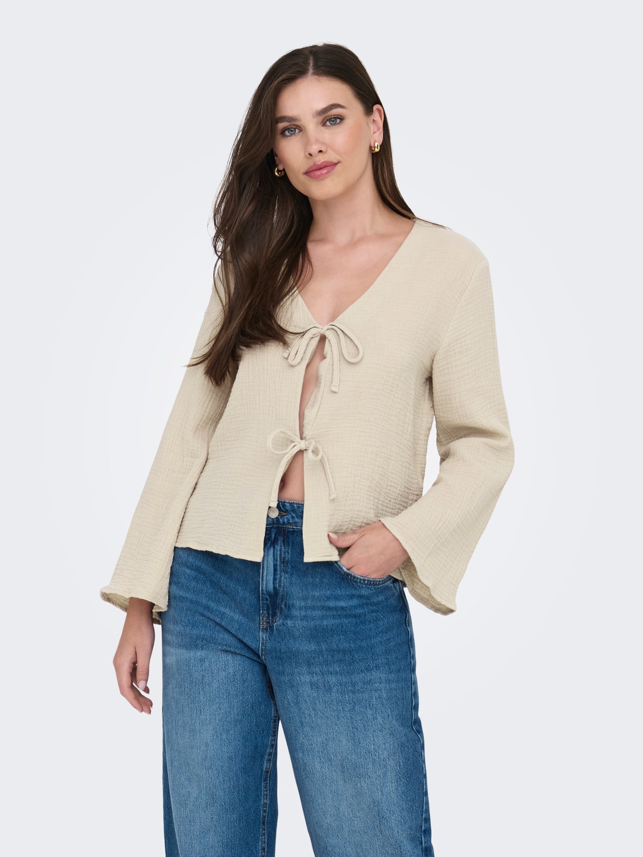 Mainiet ikdienas apģērbu sekundes laikā, pievienojot sievišķīgu topu maigai, tīrai izteiksmei.