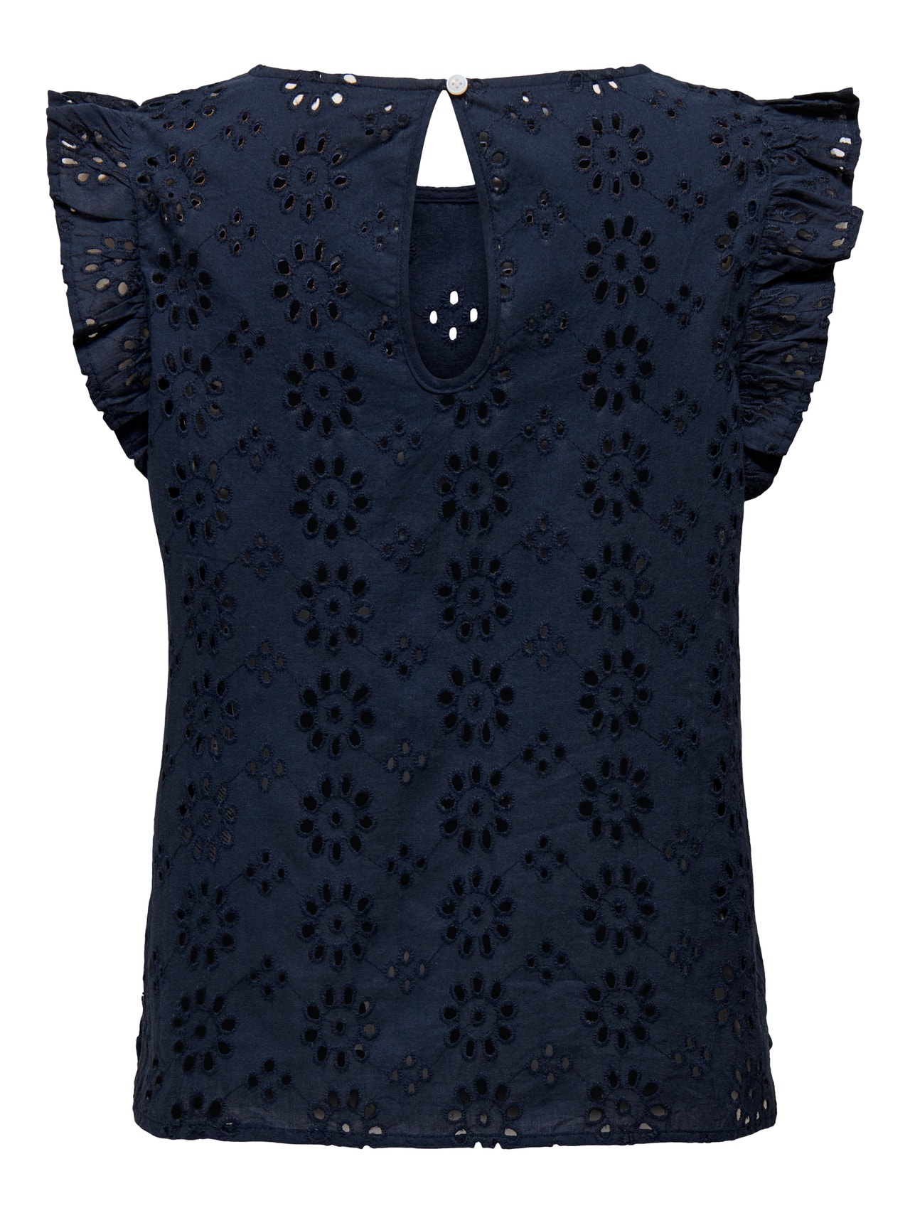 Broderie Anglaise kjennetegnes av utskjæringer og broderier, noe som skaper en vakker, blondelignende look. JDY er et komplett, internasjonalt motemerke som tilbyr rimelige og trendy produkter til motebevisste forbrukere. - Produkttype : Topp - Hals : O-hals - Erme : Ermeløs - Ermer : Volumermer - Lukking : Knappelukking - Detaljer : Rysjer - Passform : Regular Fit